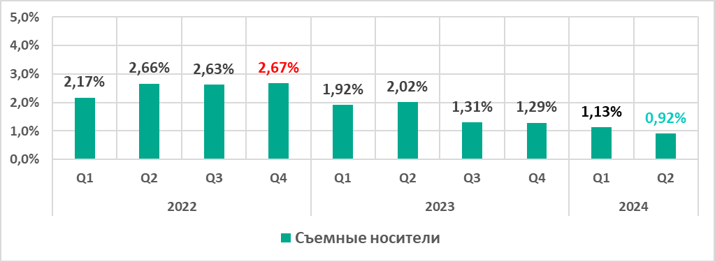| Съемные носители | 1,13% | 0,92% | -0,21 п.п. |