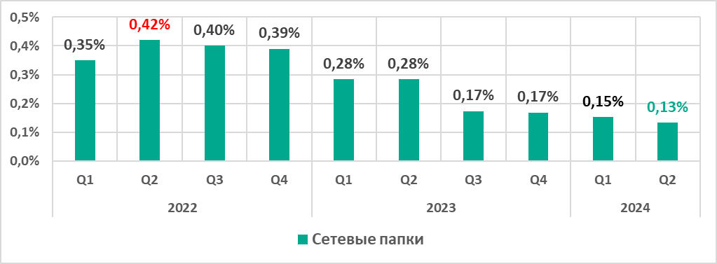 | Сетевые папки | 0,15% | 0,13% | -0,02 п.п. |