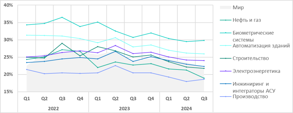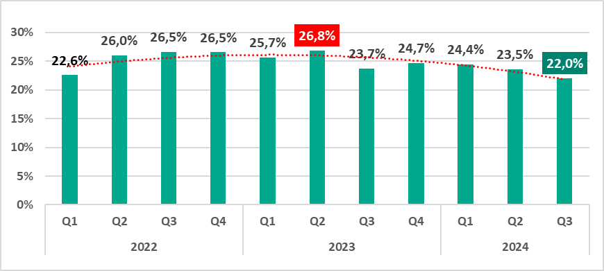 По сравнению с третьим кварталом 2023 года это значение уменьшилось на 1,7 п. п.