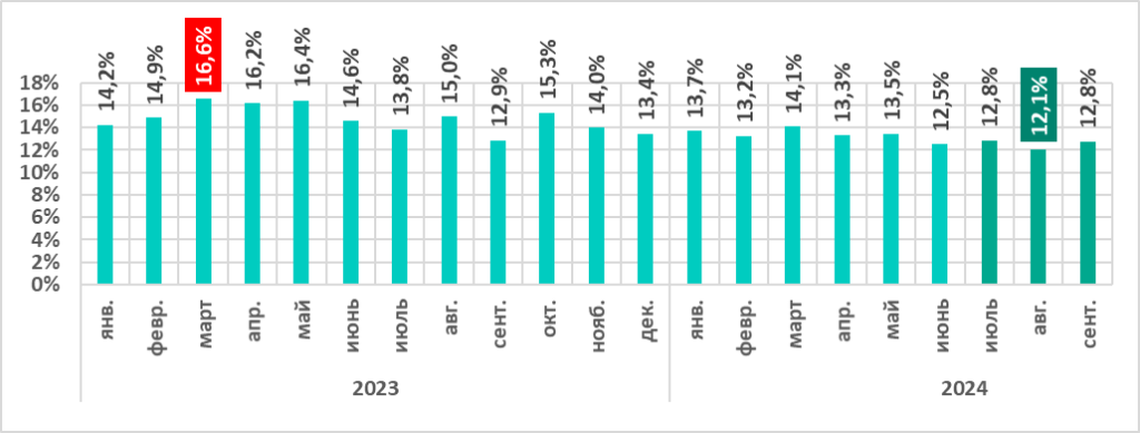 Ежемесячное значение показателя колебалось в течение всего третьего квартала, достигнув в сентябре 2024 года наиболее высокого значения с ноября 2023 года.