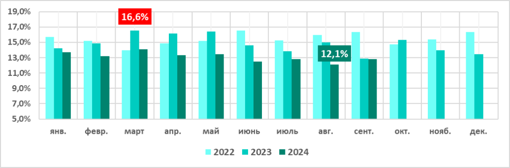 Месячные значения показателя в третьем квартала 2024 года меньше значений в те же месяцы предыдущего года.