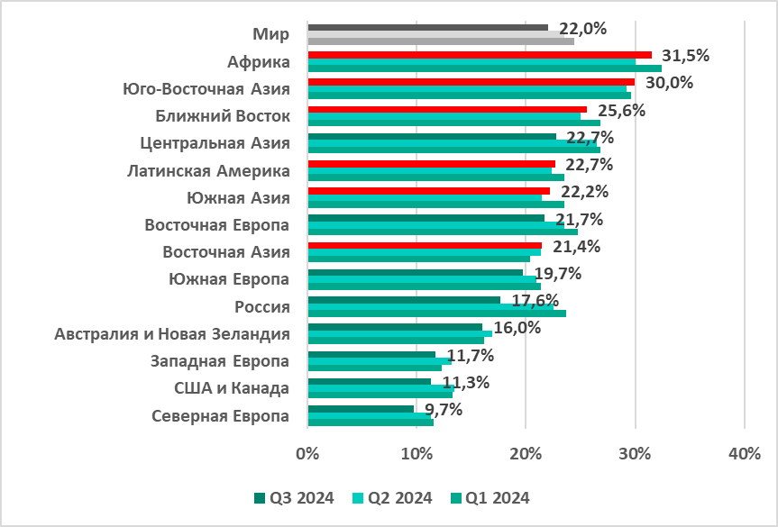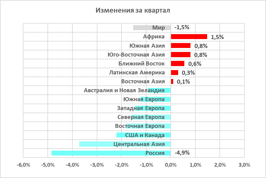 В шести регионах — Африке, Южной Азии, Юго-Восточной Азии, Латинской Америке, Восточной Азии, а также на Ближнем Востоке — показатели увеличились по сравнению с предыдущим кварталом.
