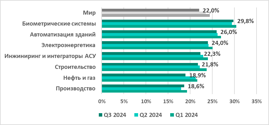 В третьем квартале 2024 года доля компьютеров АСУ, на которых были заблокированы вредоносные объекты, уменьшилась в большинстве отраслей, за исключением биометрических систем и производства.