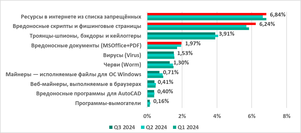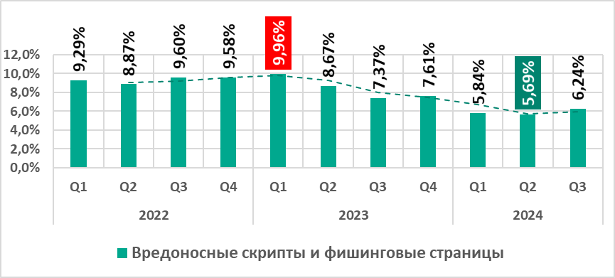 | Вредоносные скрипты и фишинговые страницы (JS и HTML) | 5,69% | 6,24% | 0,55 п.п. |