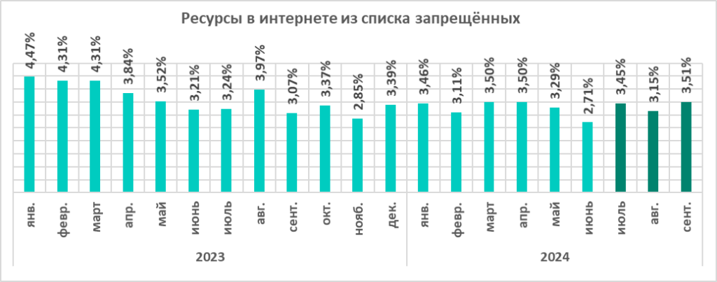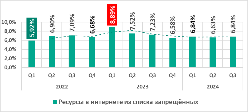 | Ресурсы в интернете из списка запрещённых | 6,63% | 6,84% | 0,21 п.п. |