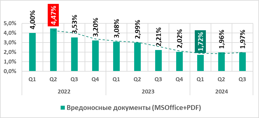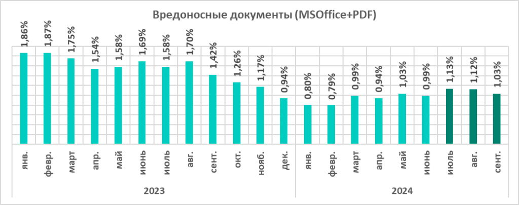 | Вредоносные документы (MSOffice + PDF) | 1,96% | 1,97% | 0,01 п.п. |