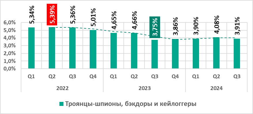 | Троянцы-шпионы, бэкдоры и кейлоггеры | 4,08% | 3,91% | -0,17 п.п. |