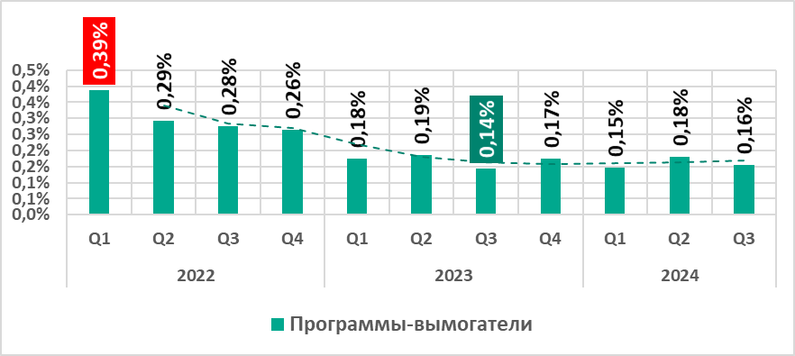 | Программы-вымогатели | 0,18% | 0,16% | -0,02 п.п. |