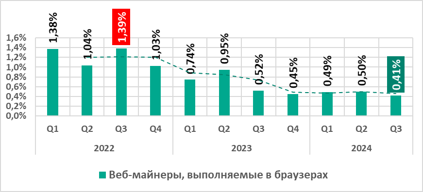 | Веб-майнеры, выполняемые в браузерах | 0,50% | 0,41% | -0,09 п.п. |