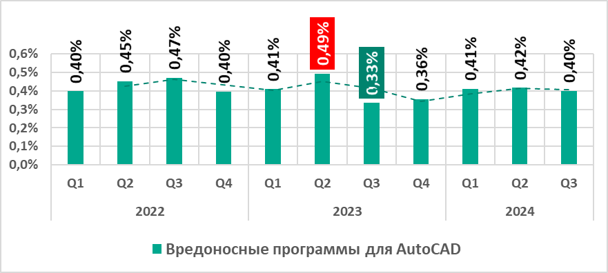 | Вредоносные программы для AutoCAD | 0,42% | 0,40% | -0,02 п.п. |
