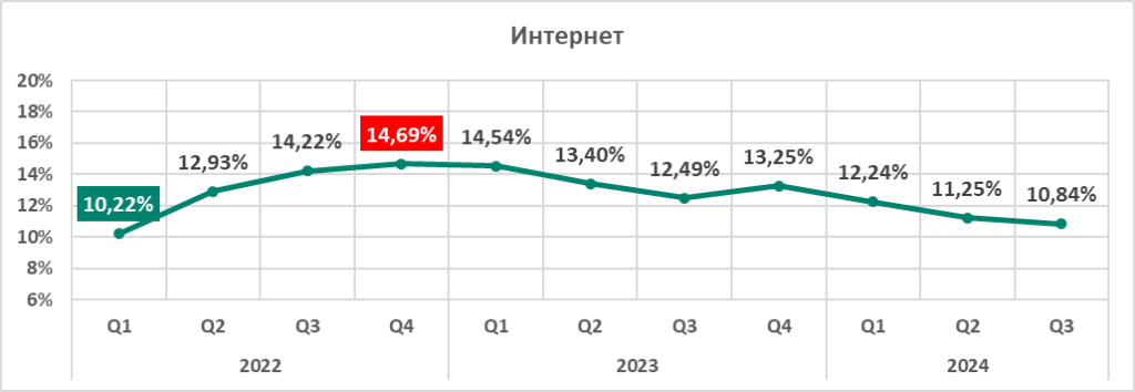 | Интернет | 11,25% | 10,84% | -0,41 п.п. |