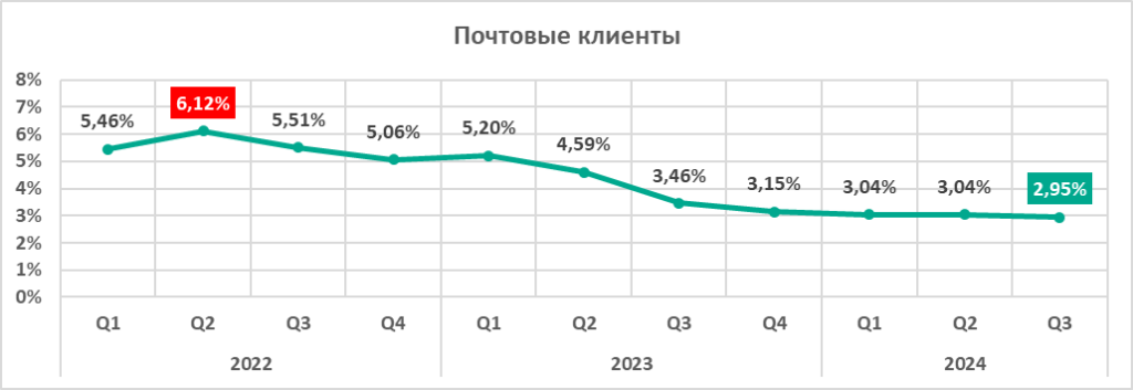 | Почтовые клиенты | 3,04% | 2,95% | -0.09 п.п. |