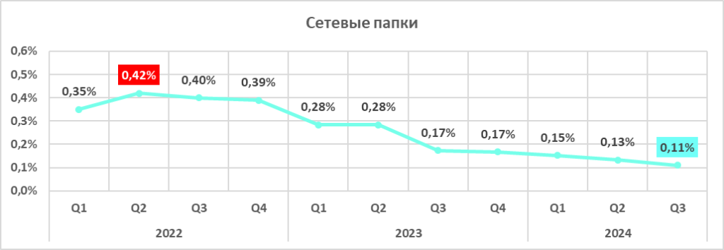 | Сетевые папки | 0,13% | 0,11% | -0,02 п.п. |