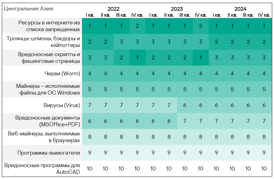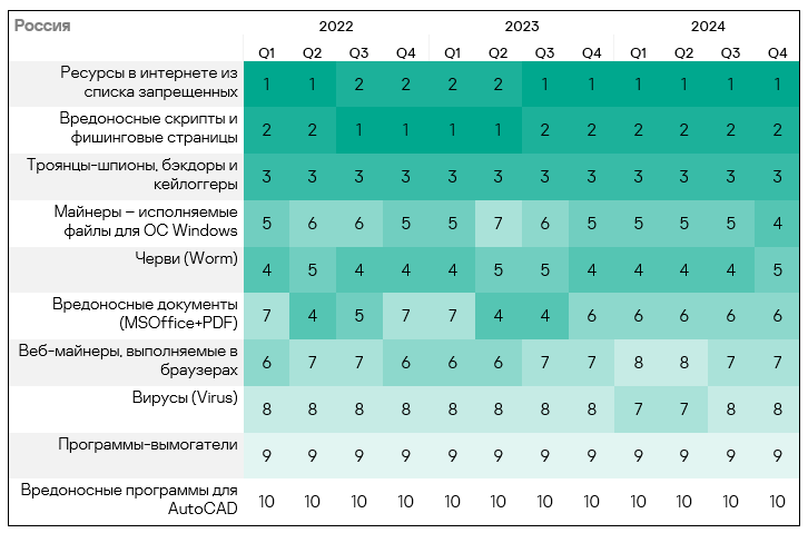 - Тепловая карта иллюстрирует изменения в рейтингах категорий угроз в России с начала 2022 года. Ведущей категорией угроз в регионе, начиная с третьего квартала 2023 года, являются ресурсы в интернете из списка запрещенных. В четвертом квартале 2024 года черви поднялись с пятого места на четвертое.