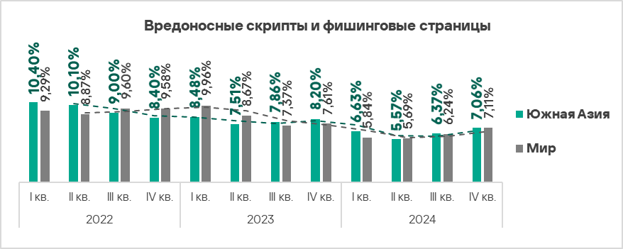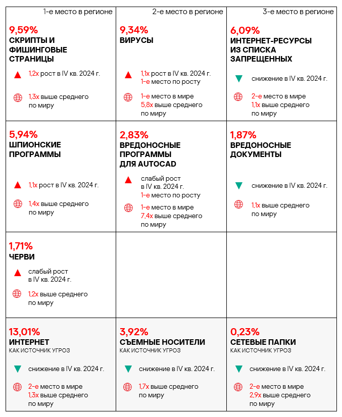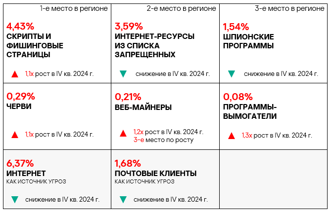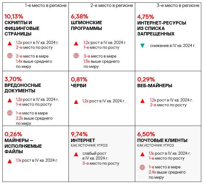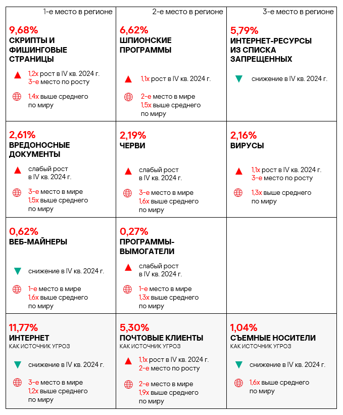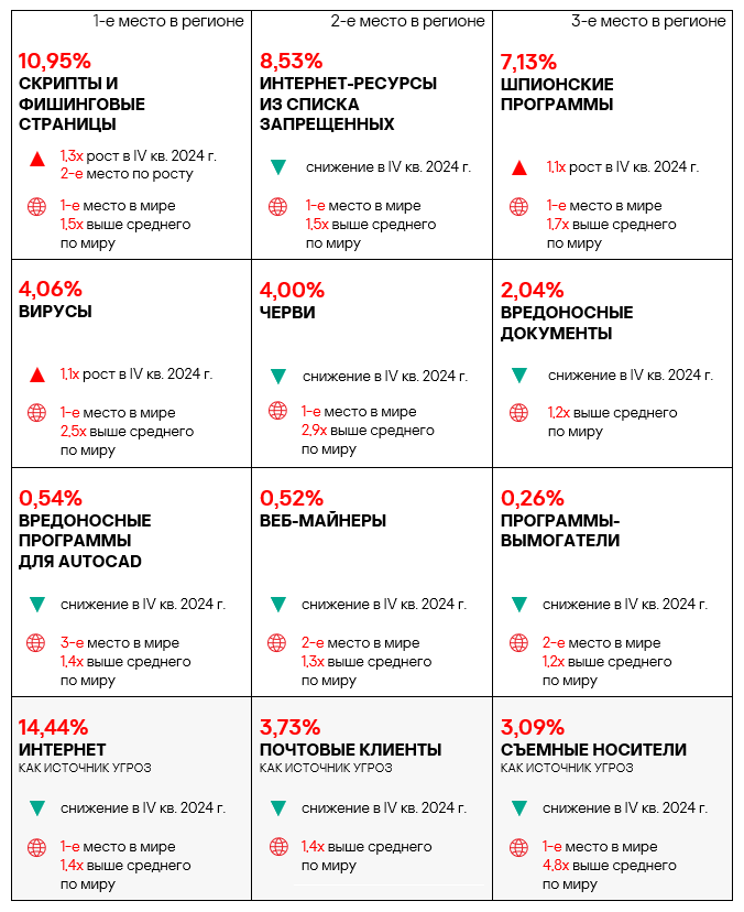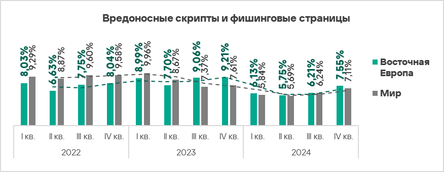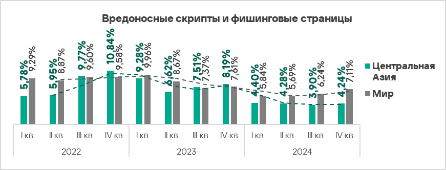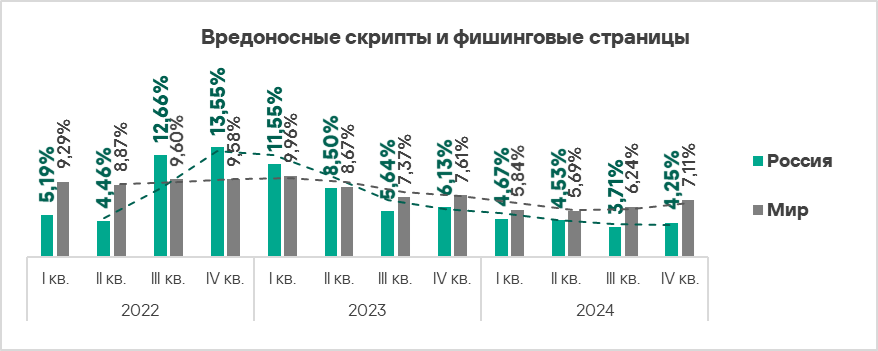 - вредоносные скрипты и фишинговые страницы — в 1,4 раза (также выше значения за третий квартал 2024 года), второе место в мире.