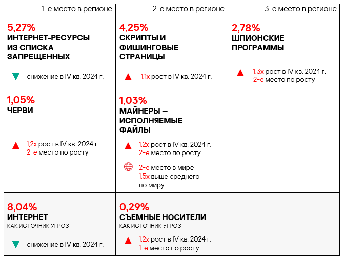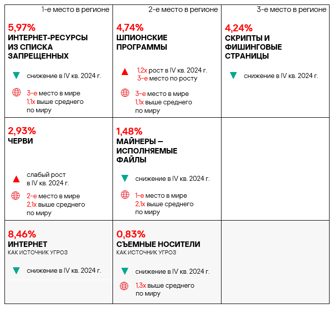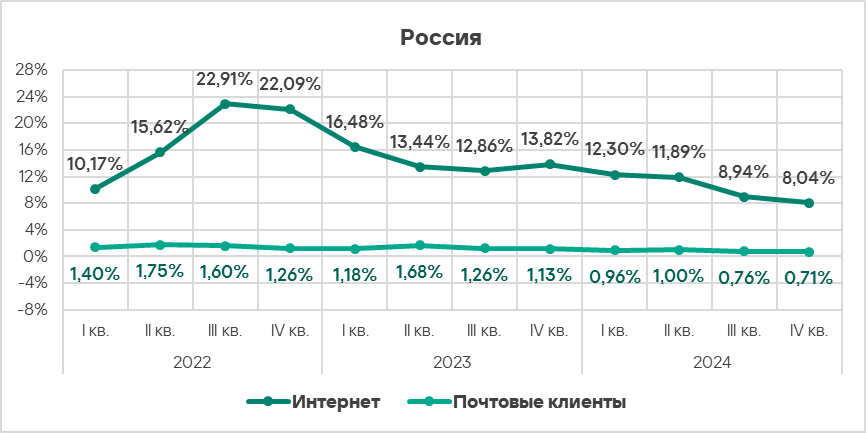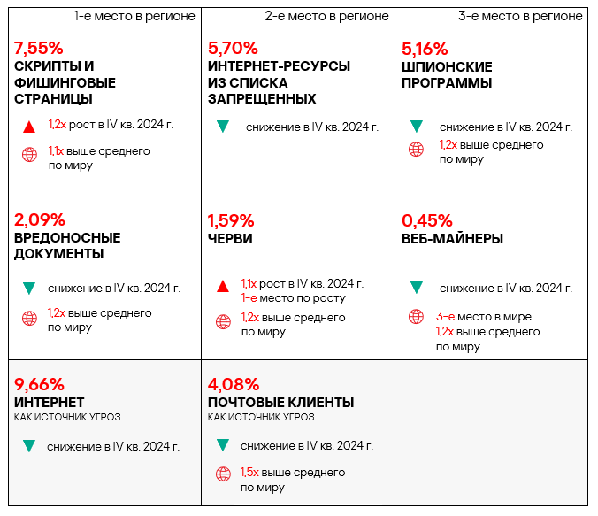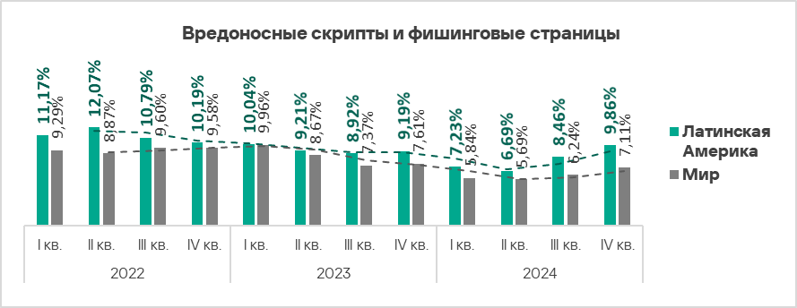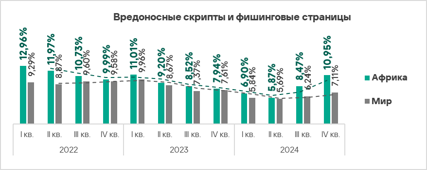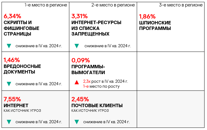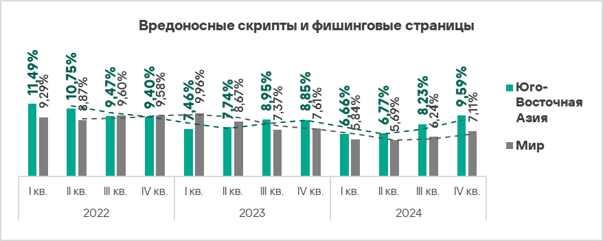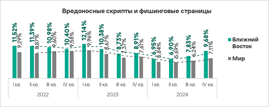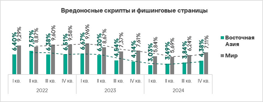 - вредоносные скрипты и фишинговые страницы — в 1,4 раза (также выше значения за третий квартал 2024 года), второе место в мире.