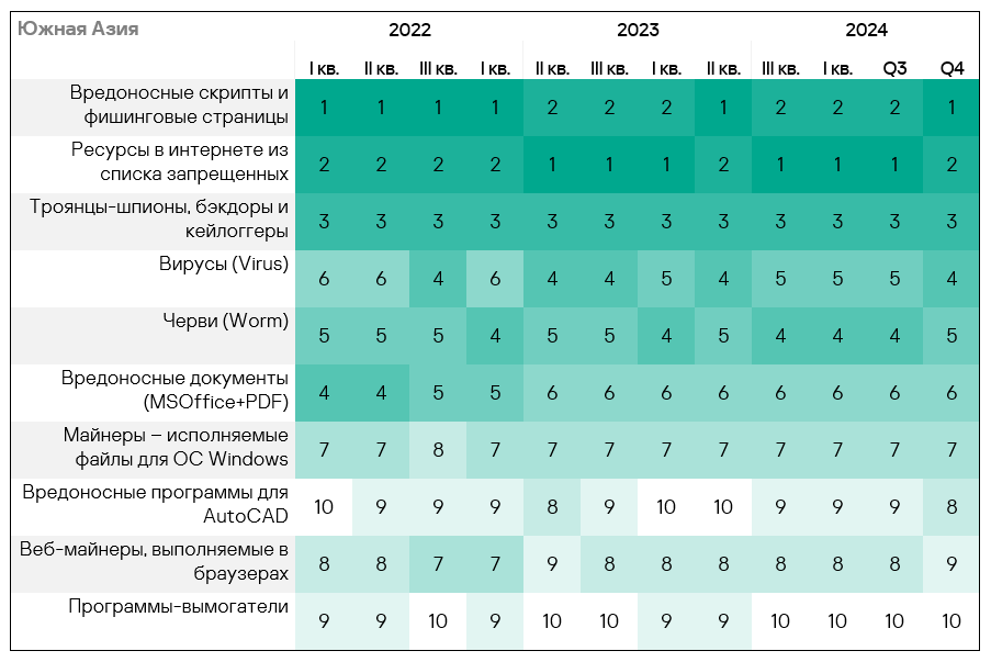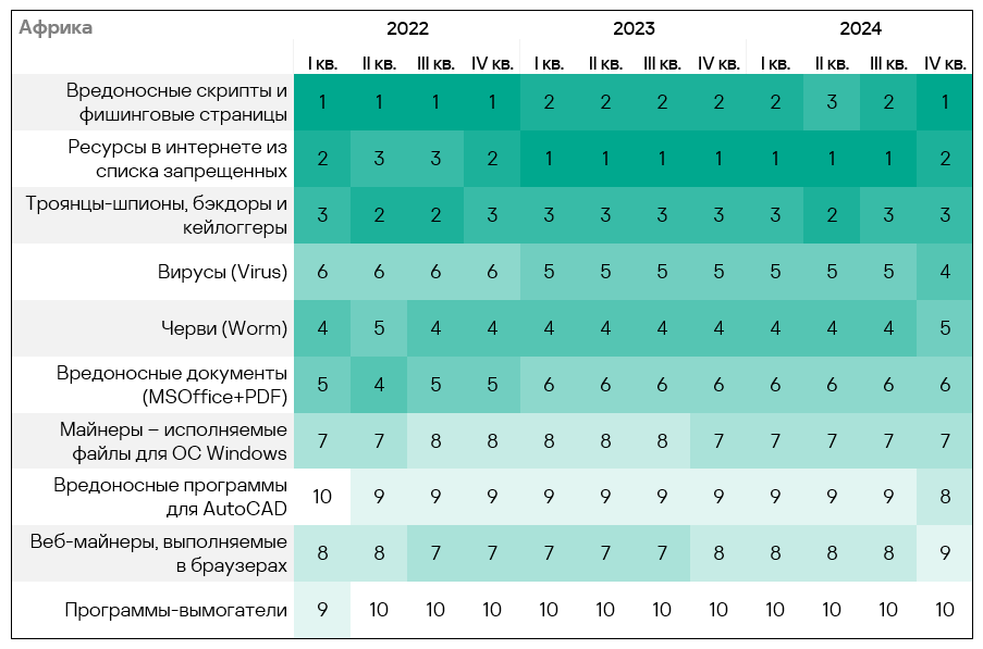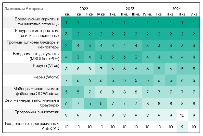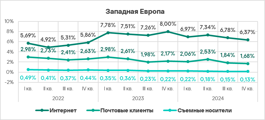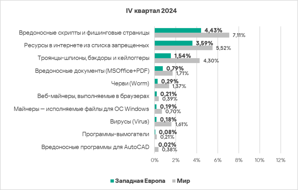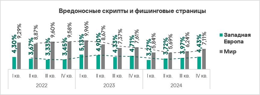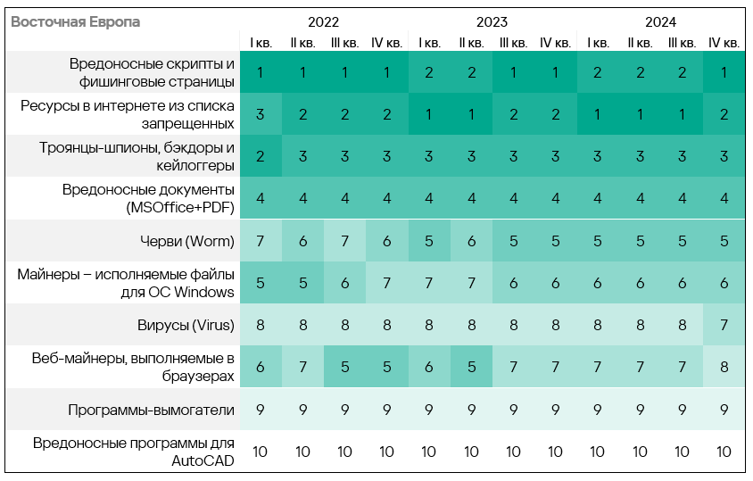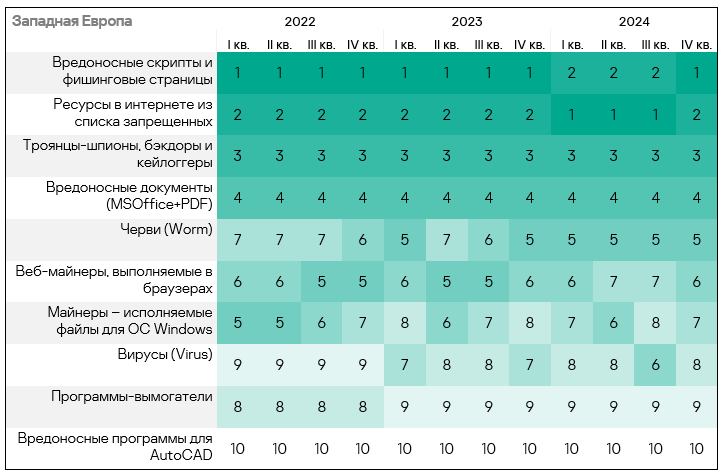- Тепловая карта иллюстрирует изменения в рейтингах категорий угроз в Западной Европе с начала 2022 года. В четвертом квартале 2024 года вредоносные скрипты и фишинговые страницы вернулись на вершину рейтинга, а вирусы упали на восьмую строчку.