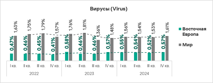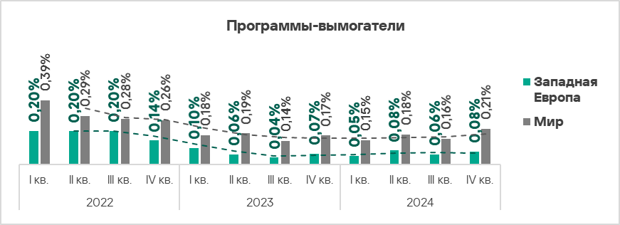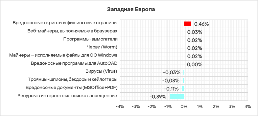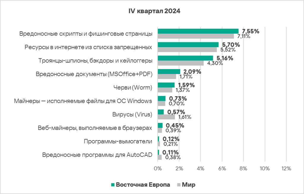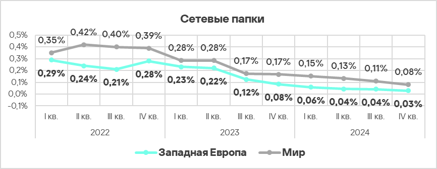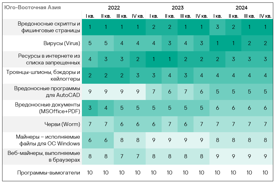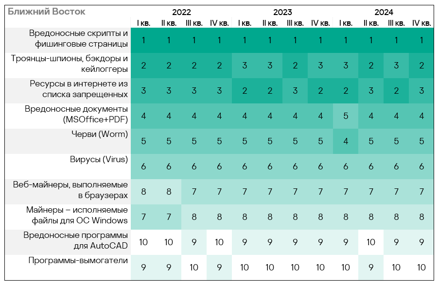- Тепловая карта иллюстрирует изменения в рейтингах категорий угроз в Западной Европе с начала 2022 года. В четвертом квартале 2024 года вредоносные скрипты и фишинговые страницы вернулись на вершину рейтинга, а вирусы упали на восьмую строчку.