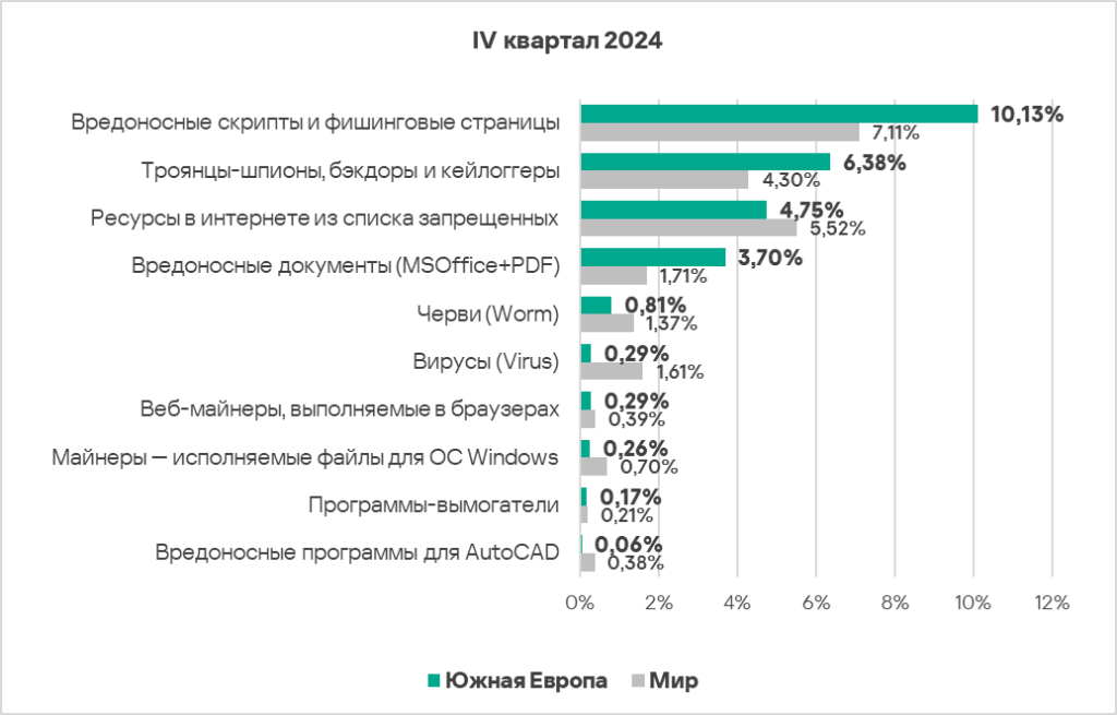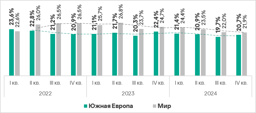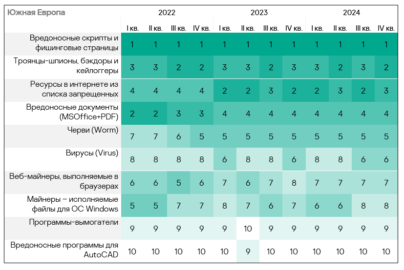 - Тепловая карта иллюстрирует изменения в рейтингах категорий угроз в Южной Европе с начала 2022 года. Вредоносные скрипты и фишинговые страницы остаются ведущей категорией угроз в регионе на протяжении всего рассматриваемого периода. В четвертом квартале 2024 года шпионские программы вернулись с третьего места на второе.