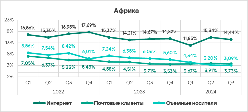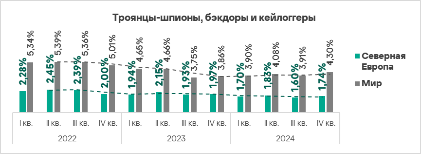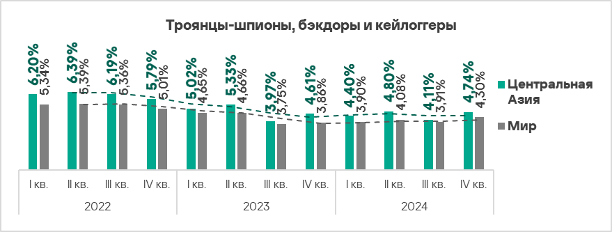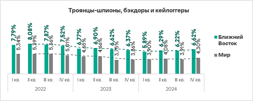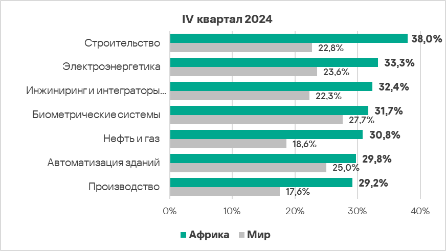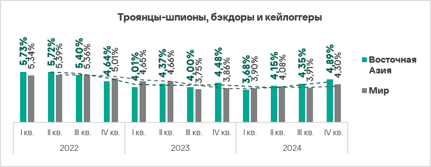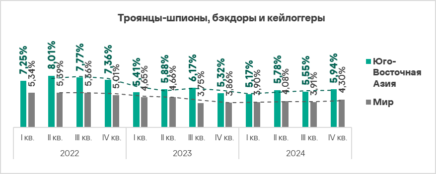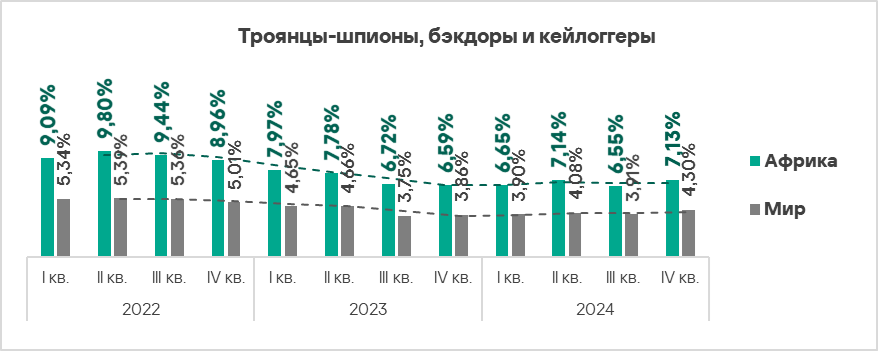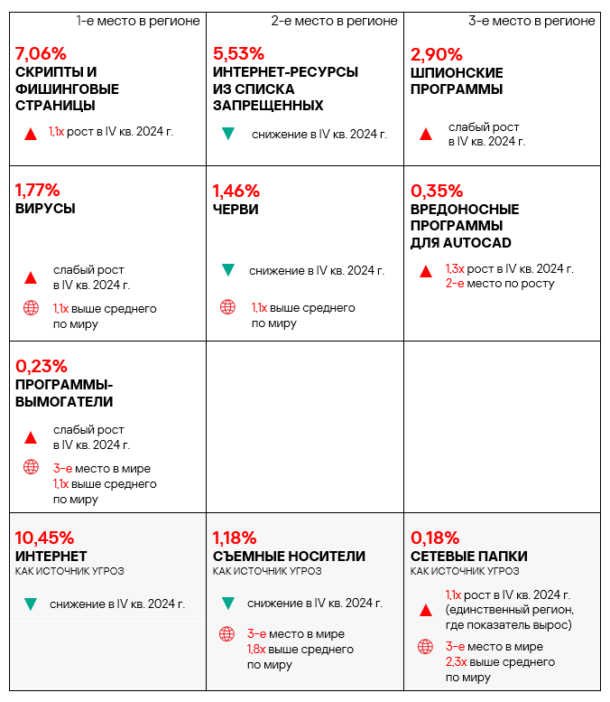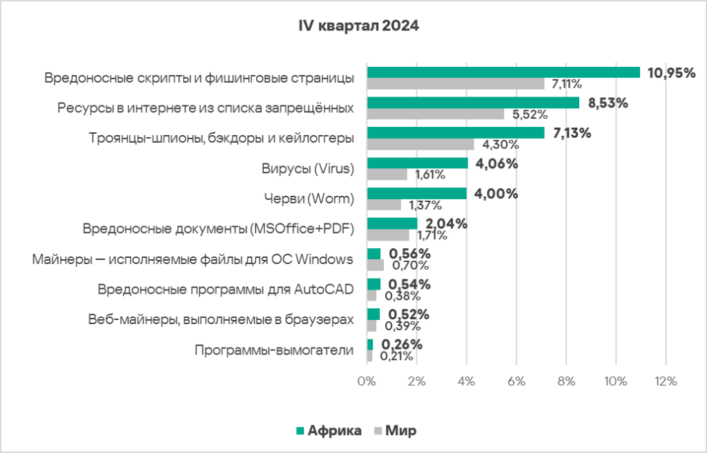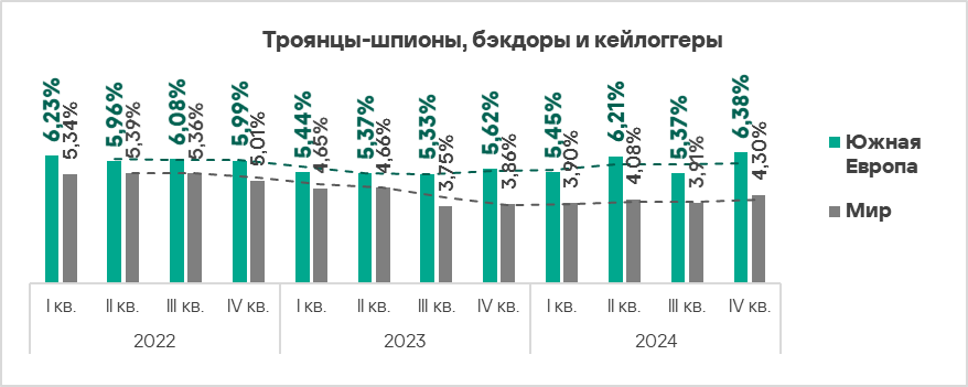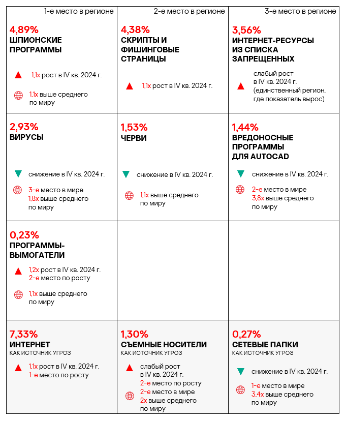 В четвертом квартале 2024 года топ 3 регионов по доле компьютеров АСУ, на которых были заблокированы шпионские программы, составили Африка, Ближний Восток и Южная Европа. Эти регионы также входят в число лидеров по угрозам первичного заражения.