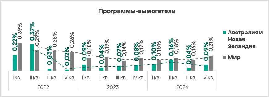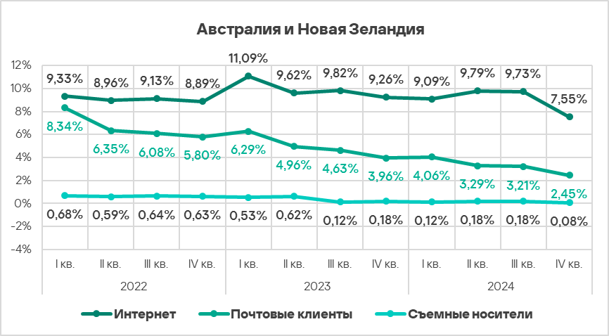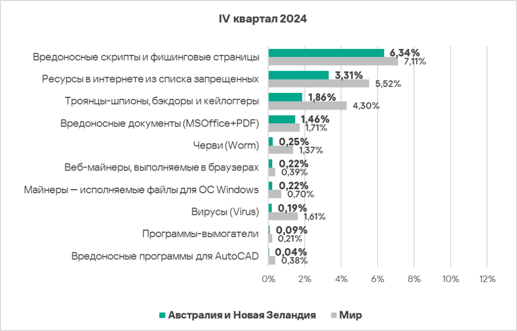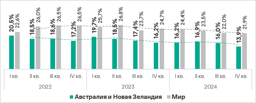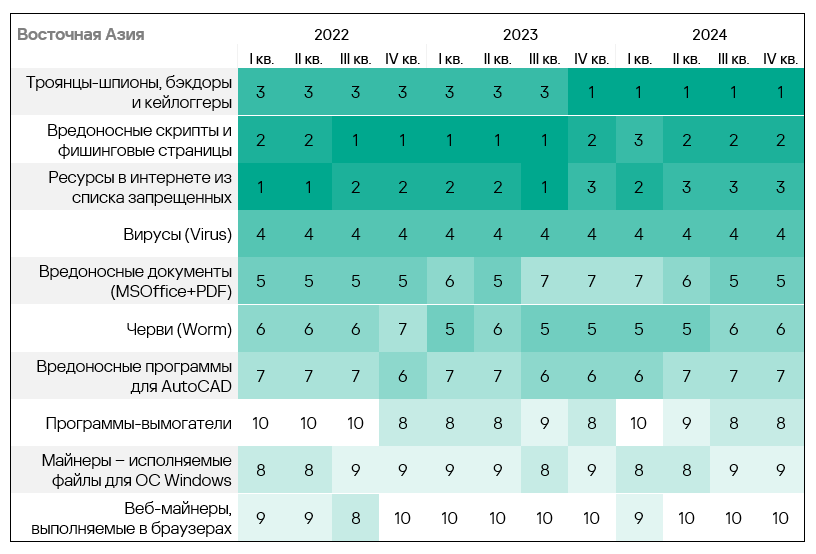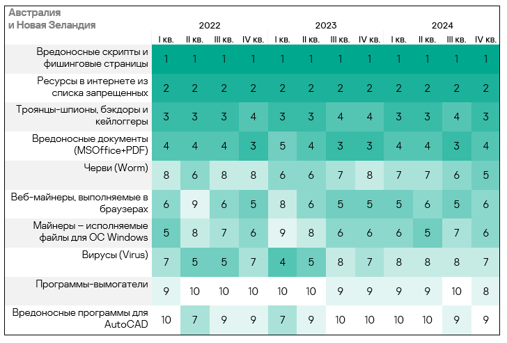 - Тепловая карта иллюстрирует изменения в рейтингах категорий угроз в Австралии и Новой Зеландии с начала 2022 года. Все это время вредоносные скрипты и фишинговые страницы остаются ведущей категорией угроз в регионе, а ресурсы в интернете из списка запрещенных занимают второе место. В четвертом квартале 2024 года шпионские программы поднялись на третью строчку, сместив вредоносные документы, а черви — с шестой на пятую.