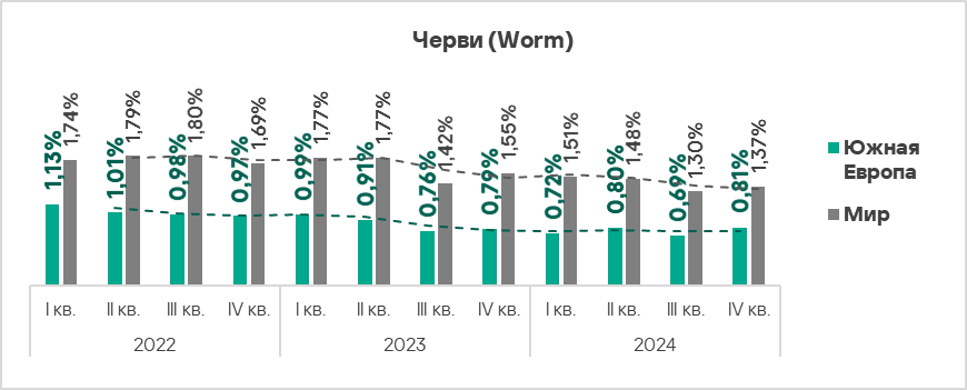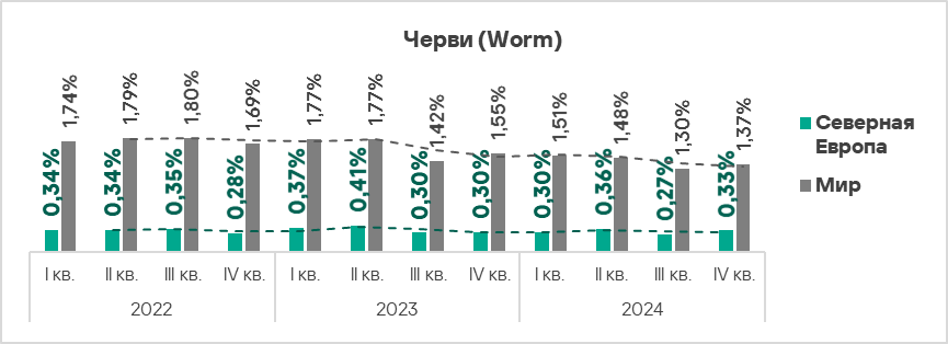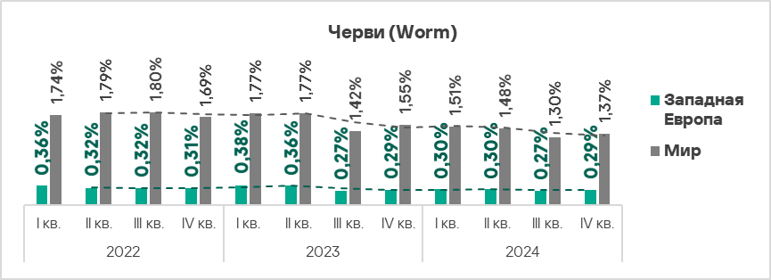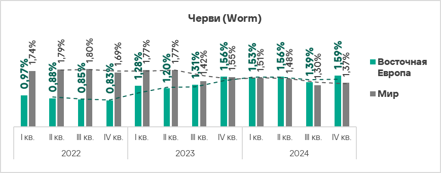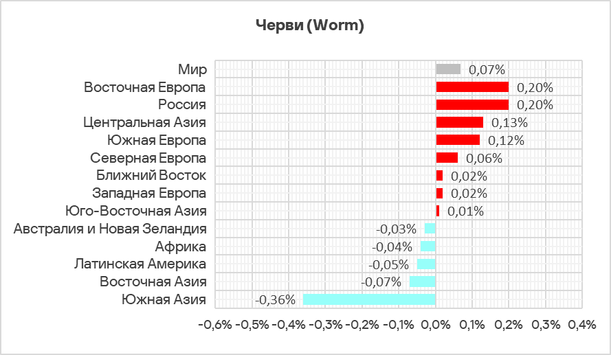 В мире черви находятся на шестом месте в рейтинге категорий угроз по доле компьютеров АСУ, на которых они были заблокированы. При этом в Африке, Центральной Азии и Южной Азии черви занимают более высокую позицию — четвертое место в соответствующих региональных рейтингах.