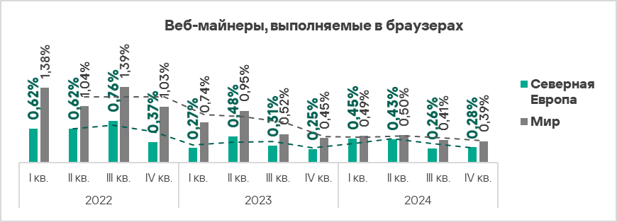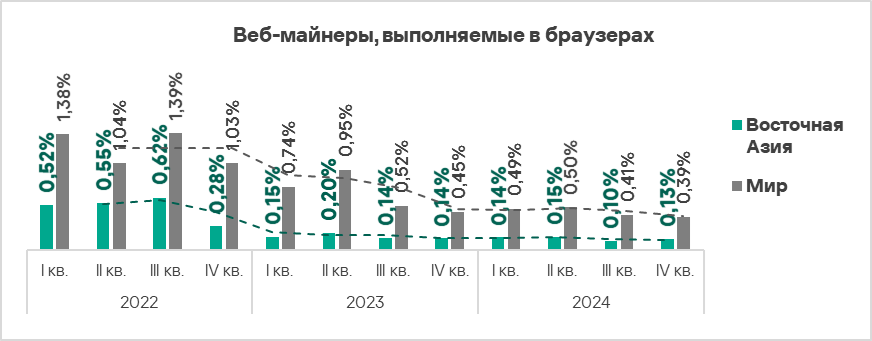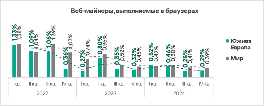 В четвертом квартале 2024 года рост доли компьютеров АСУ, на которых были заблокированы веб-майнеры, зафиксирован в Южной Европе, Западной Европе, Северной Европе и Восточной Азии.
