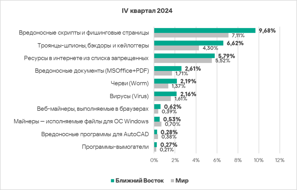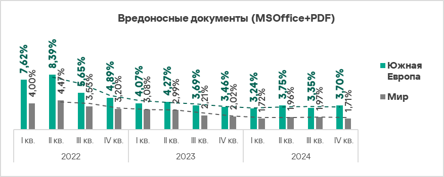 - вредоносные документы — в 2,2 раза (также выше значения за третий квартал 2024 года), первое место в мире;