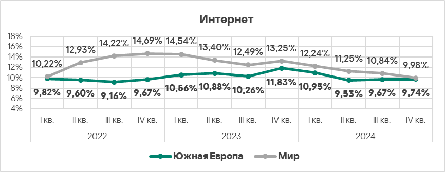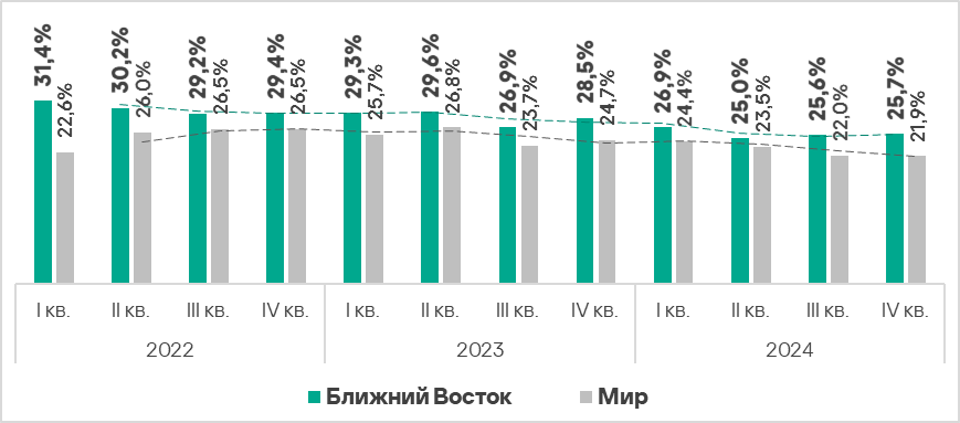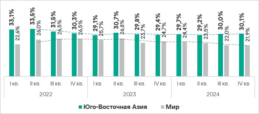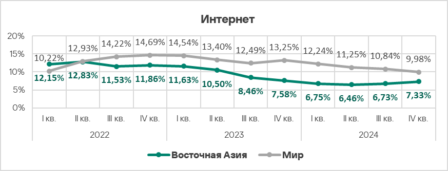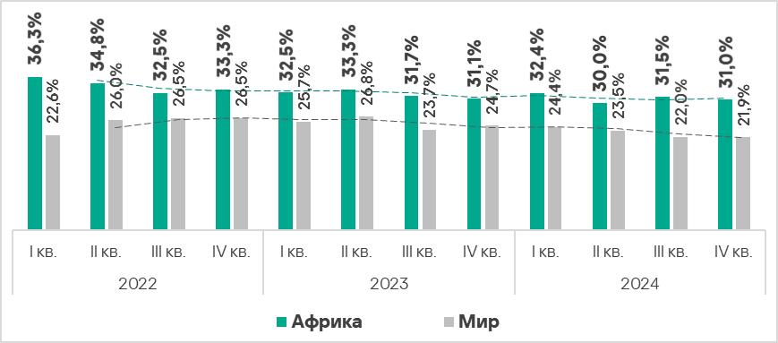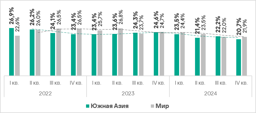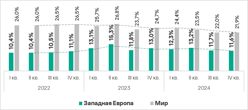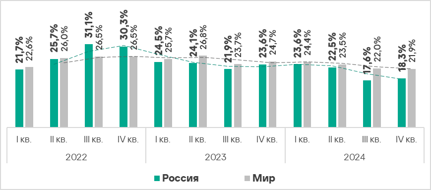 - Показатель здесь стабильно превышает среднемировое значение. В четвертом квартале 2024 года он выше среднемирового уровня в 1,4 раза.