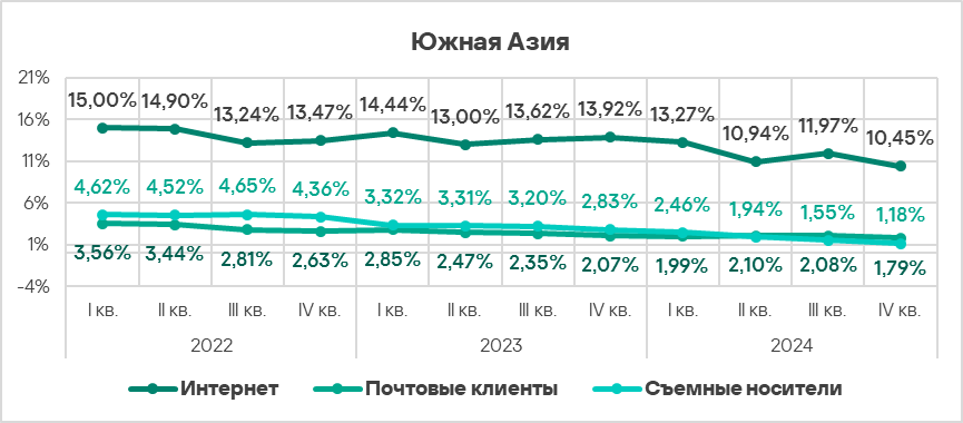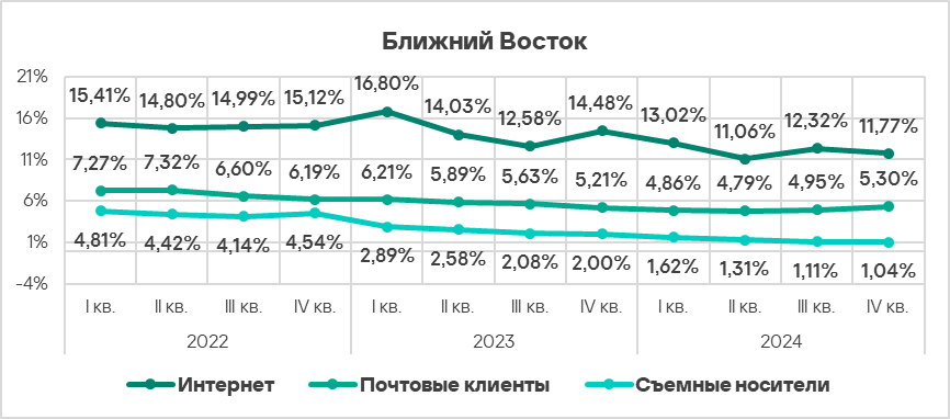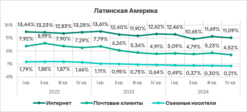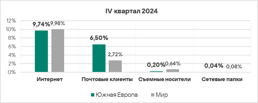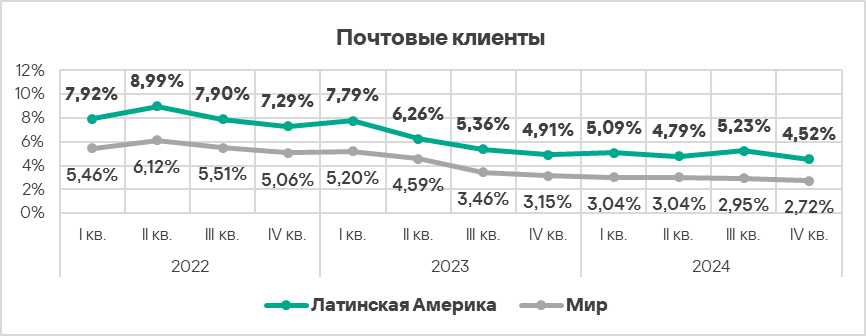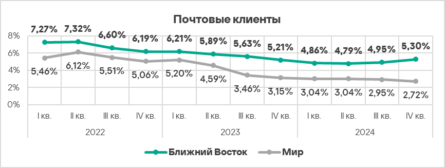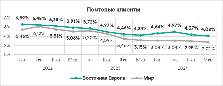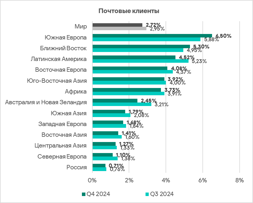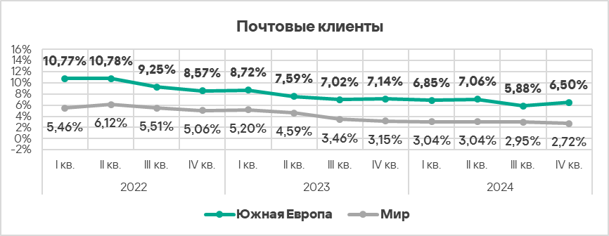 Топ 3 регионов по уровню угроз из почтовых клиентов: Южная Европа, Ближний Восток и Латинская Америка.