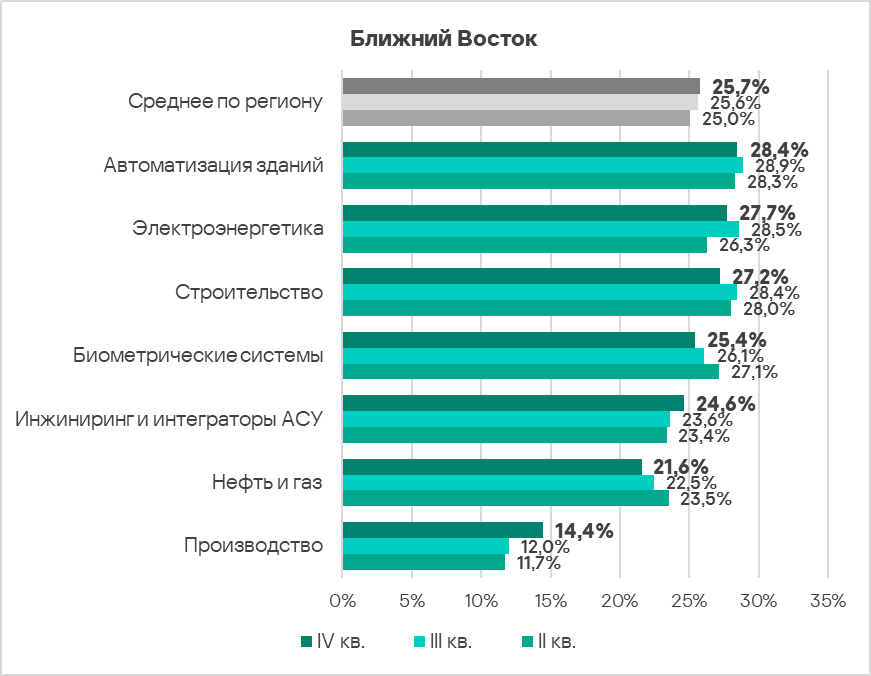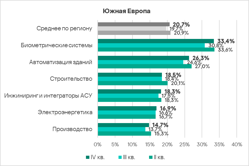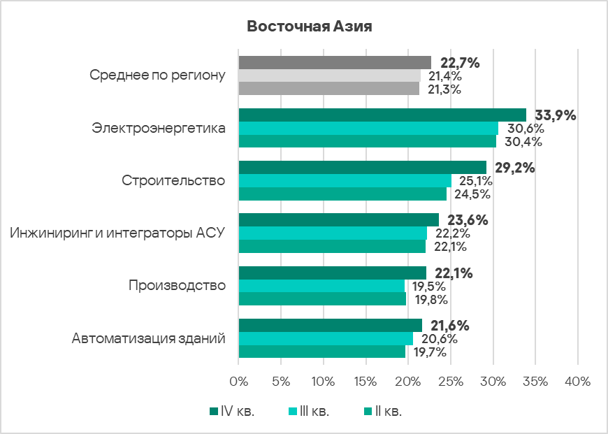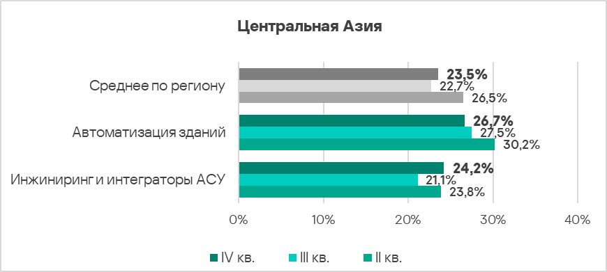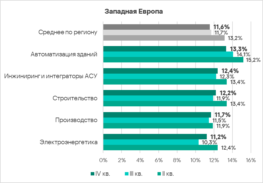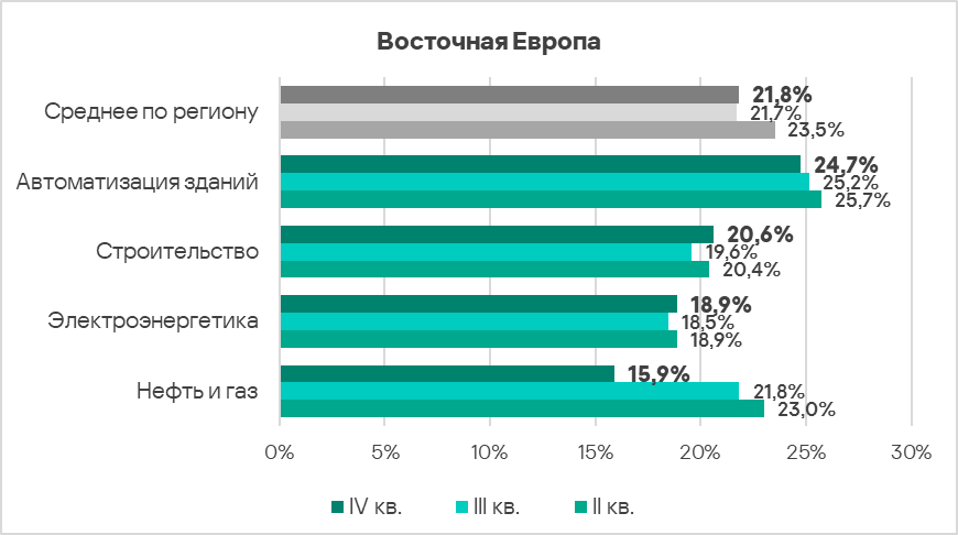 - Наиболее часто встречающейся с угрозами отраслью региона из рассмотренных в отчете является автоматизация зданий. В мировом рейтинге она находится на пятом месте среди рассмотренных отраслей.