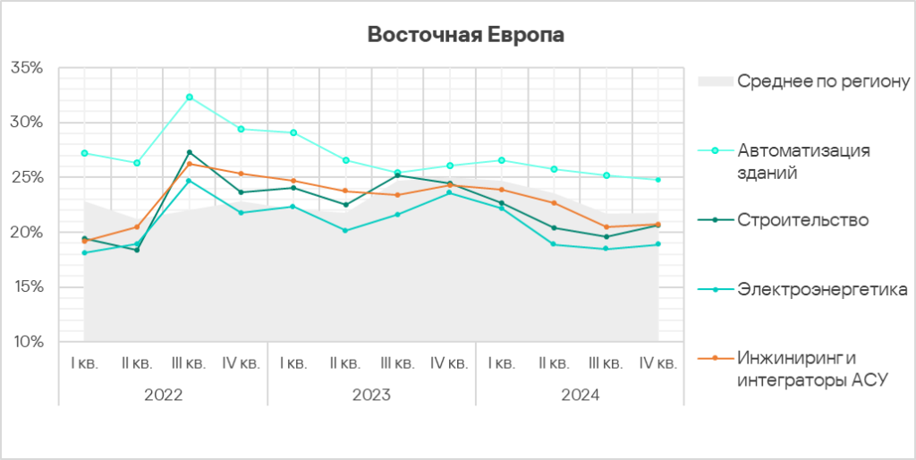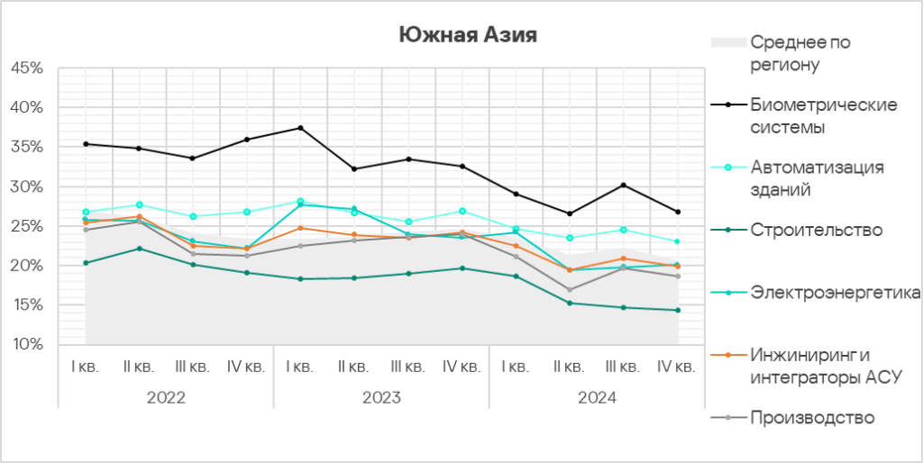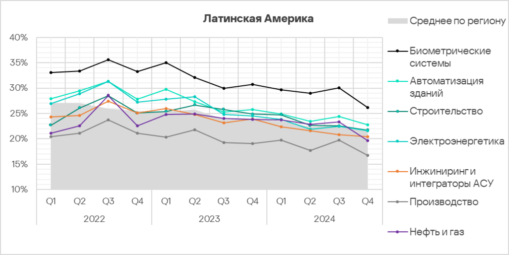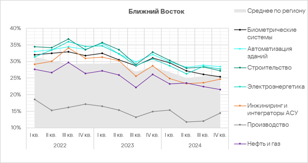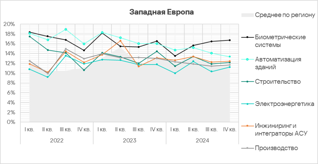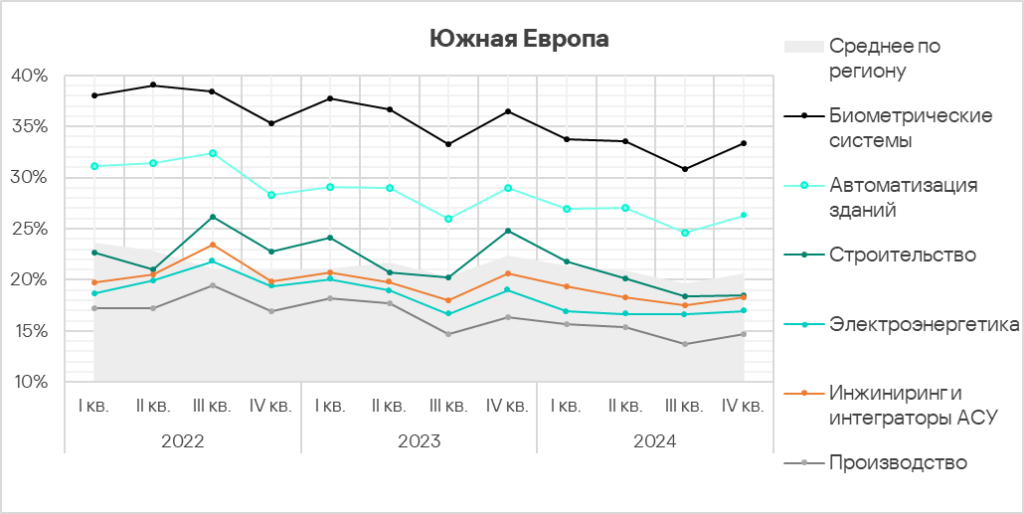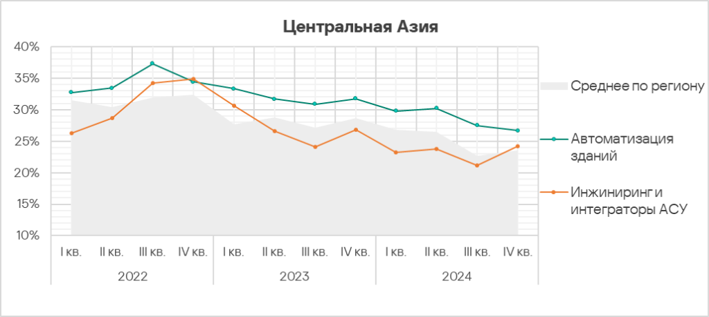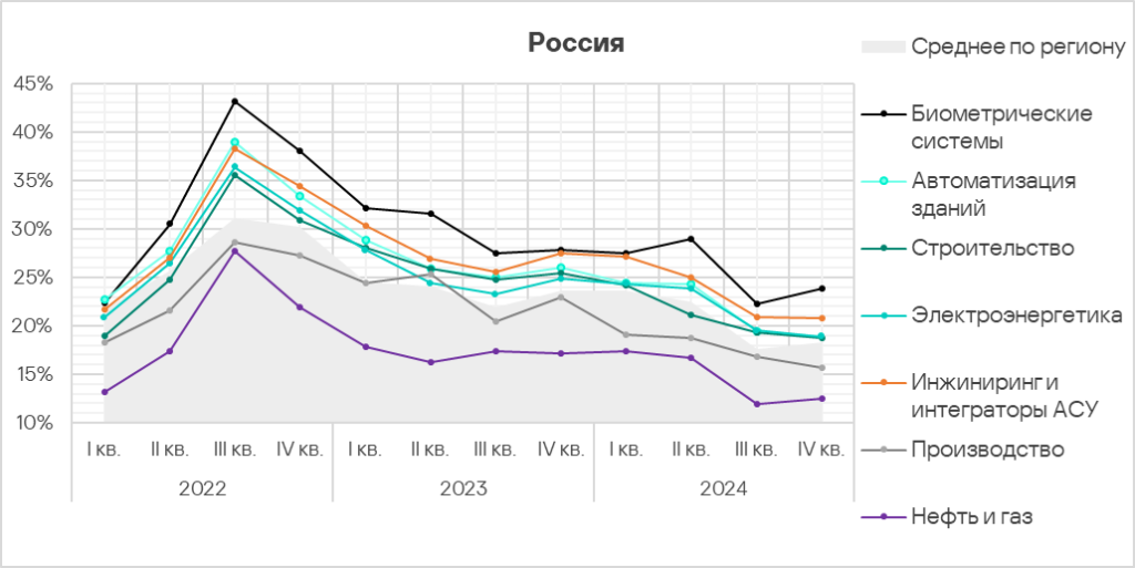 - Автоматизация зданий и биометрические системы по-прежнему демонстрируют тренды, заметно превышающие среднее для региона значение. Более того, биометрические системы демонстрируют восходящий тренд начиная со второго квартала 2024 года.
