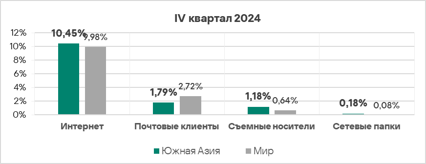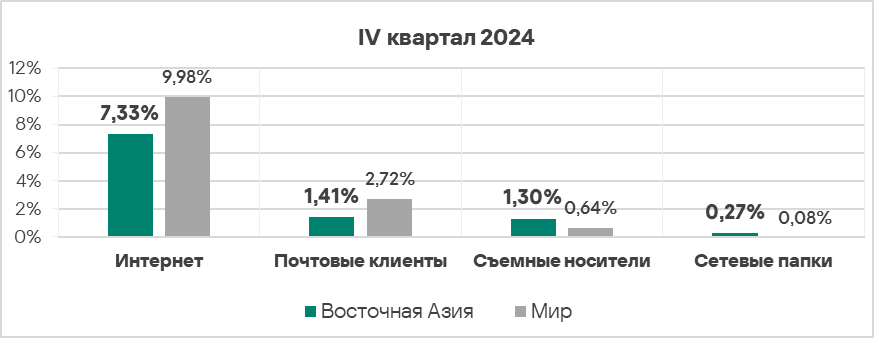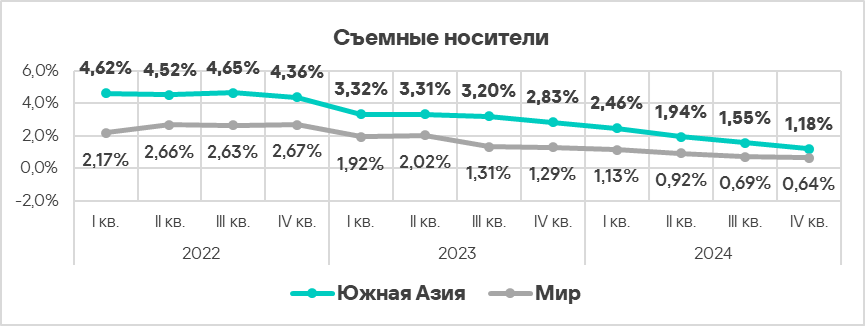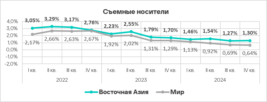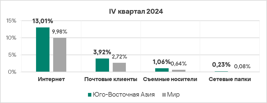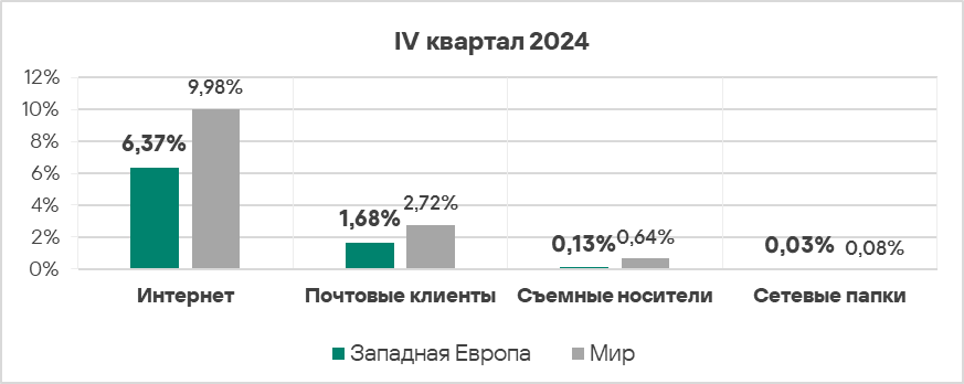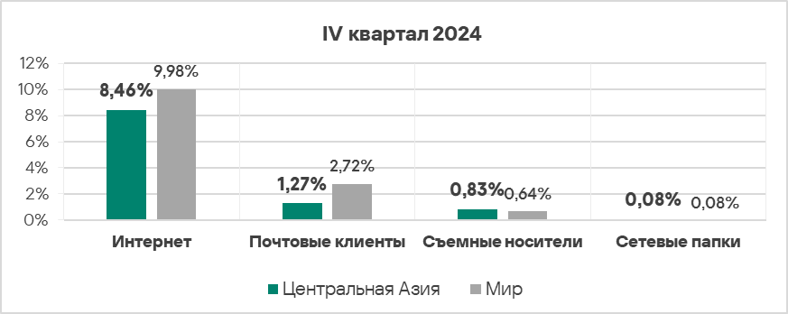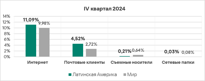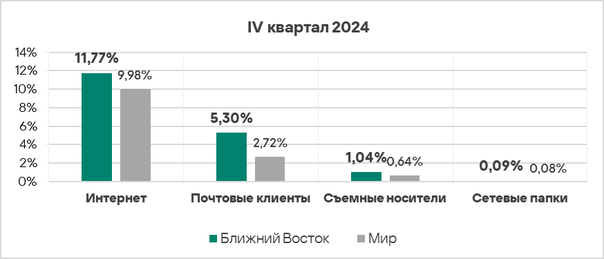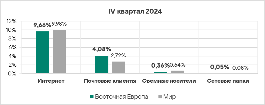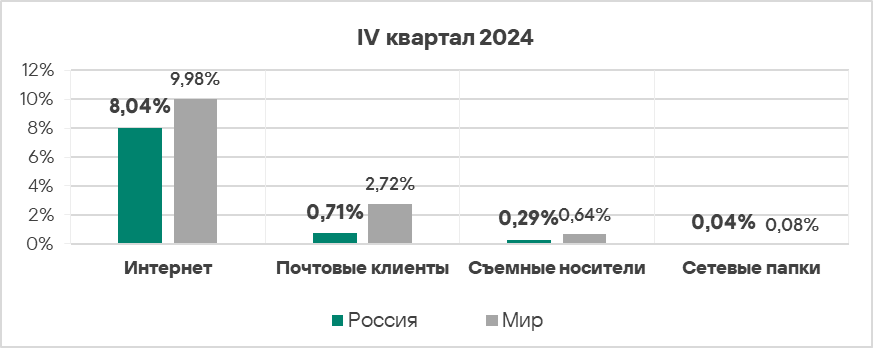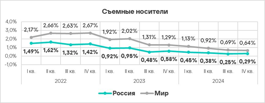 - Уровень угроз со съемных носителей в четвертом квартале 2024 года вырос в 1,2 раза. По росту этого показателя Россия занимает первое место в мире.