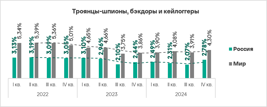 - шпионские программы — в 1,5 раза (также выше значения за третий квартал 2024 года), третье место в мире;