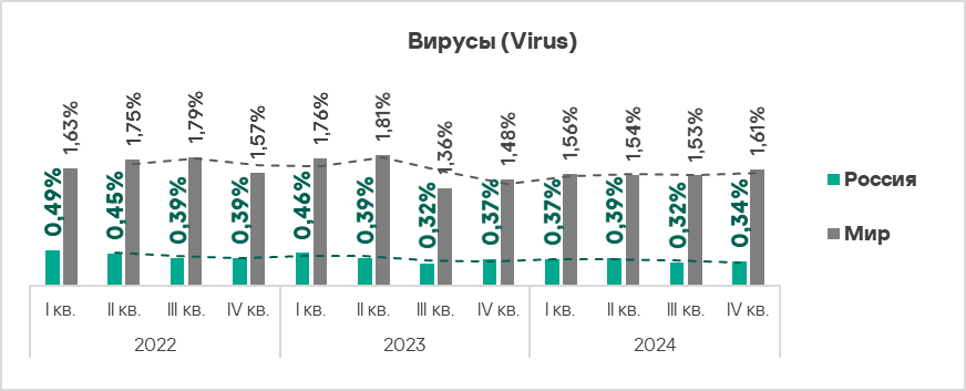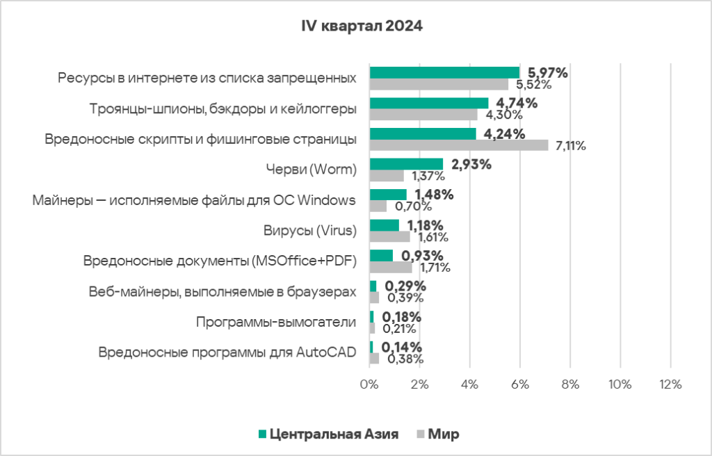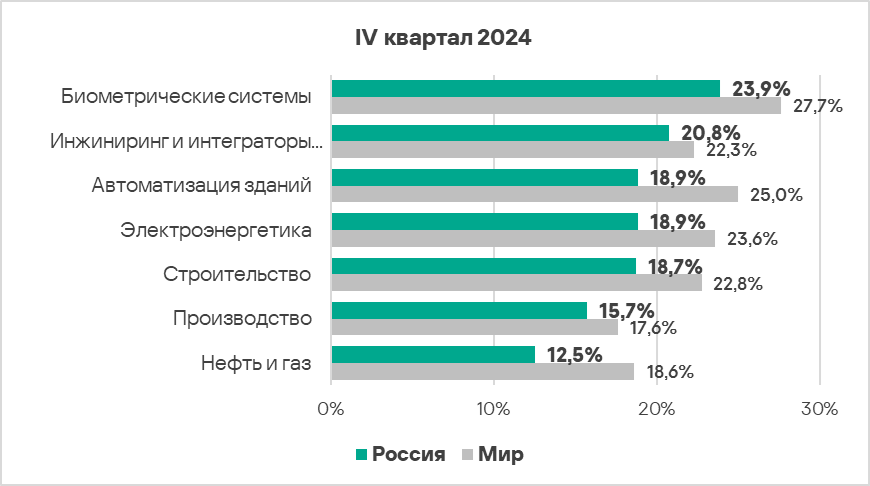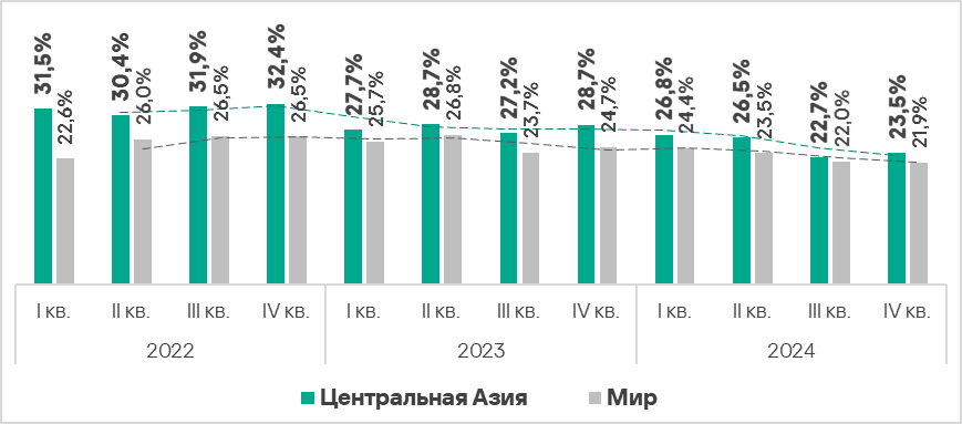В мире в четвертом квартале 2024 года доля компьютеров АСУ, на кoторых были заблокированы вредоносные объекты, уменьшилась по сравнению с предыдущим кварталом на 0,1 п. п. и составила 21,9%.