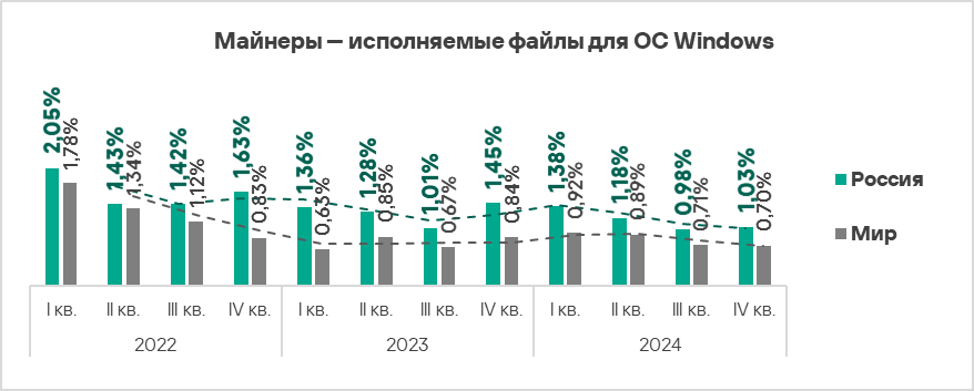 - майнеры — исполняемые файлы для ОС Windows — в 1,2 раза (в противовес мировой тенденции), второе место по росту показателя в мире.