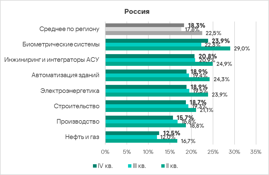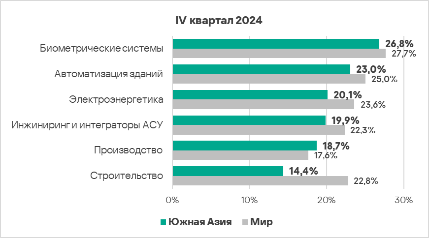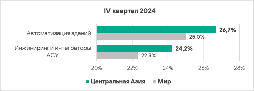 - В биометрических системах и автоматизации зданий зафиксирована наиболее высокая доля компьютеров АСУ, на которых были заблокированы вредоносные объекты — в 1,2 и 1,1 раза выше среднемирового значения соответственно.