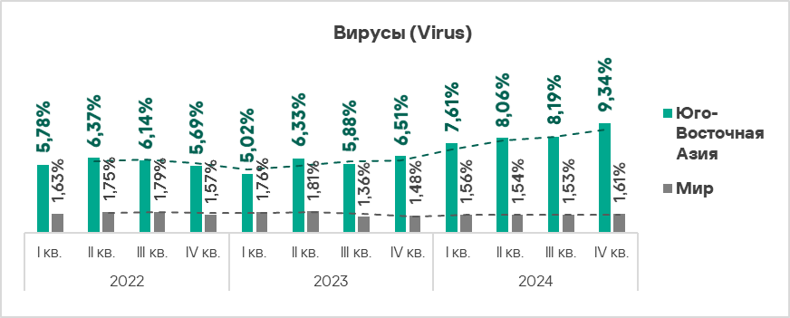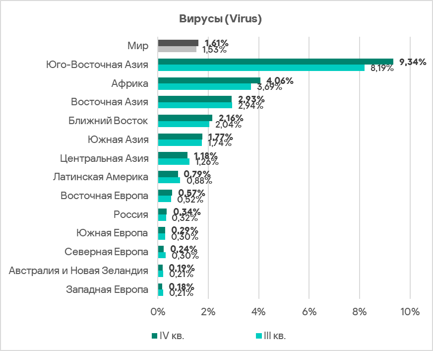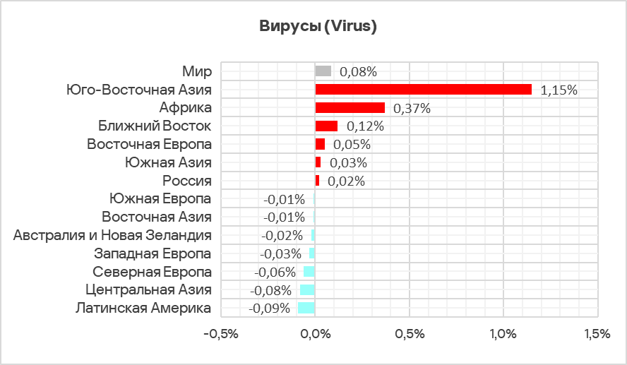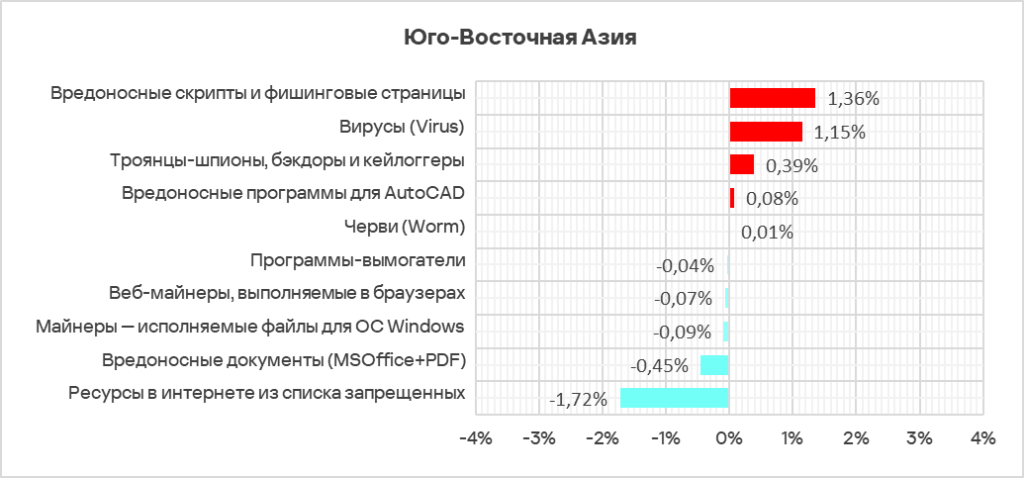 В Юго-Восточной Азии вирусы находятся на втором месте в региональном рейтинге категорий угроз по доле компьютеров АСУ, на которых они были заблокированы.
