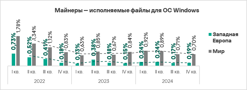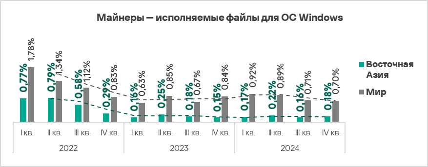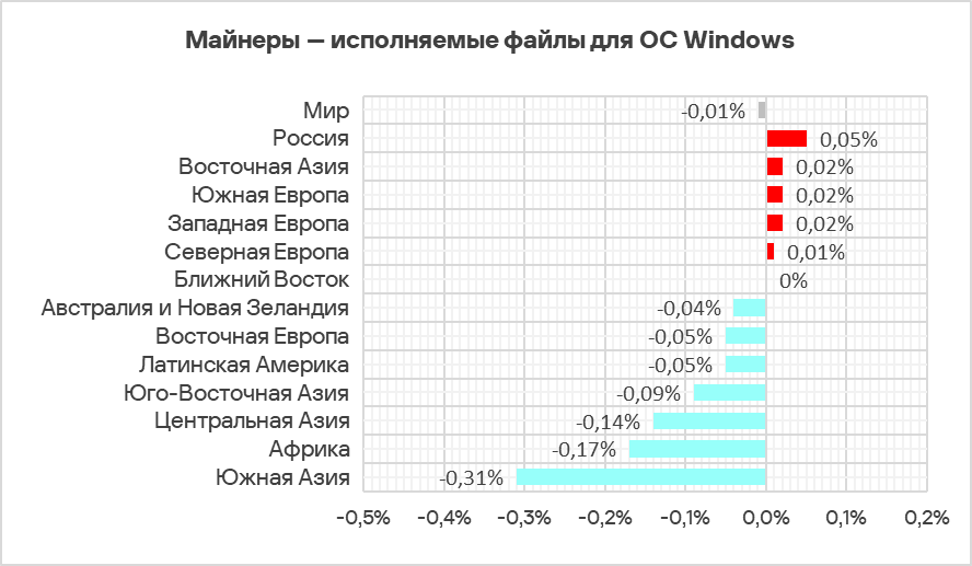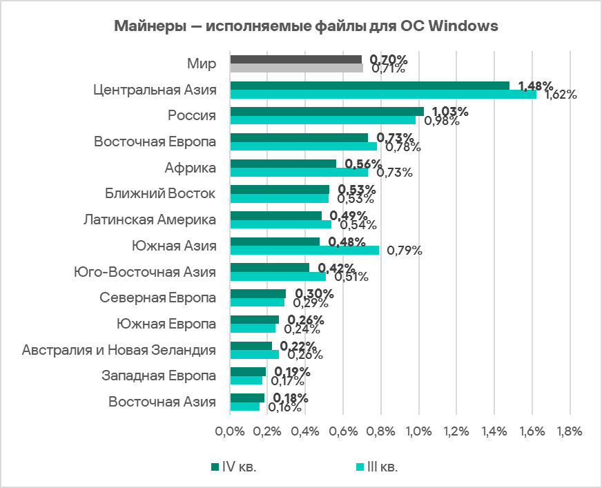ВВ мире в рейтингах категорий угроз по доле компьютеров АСУ, на которых они были заблокированы, майнеры — исполняемые файлы для ОС Windows находятся на седьмом месте.