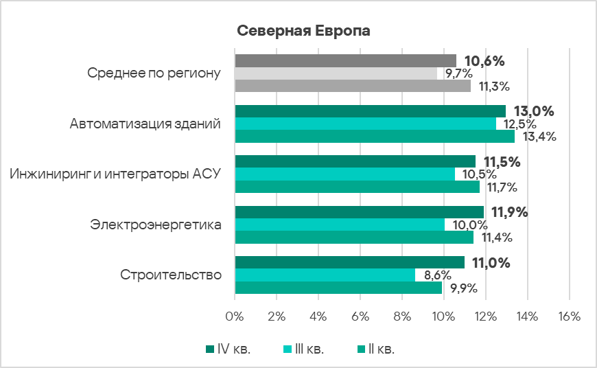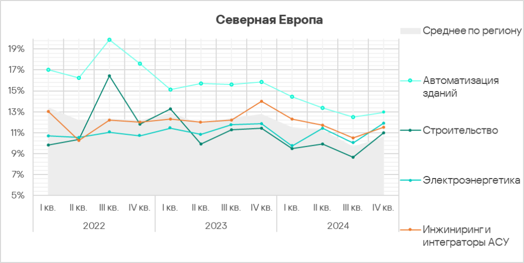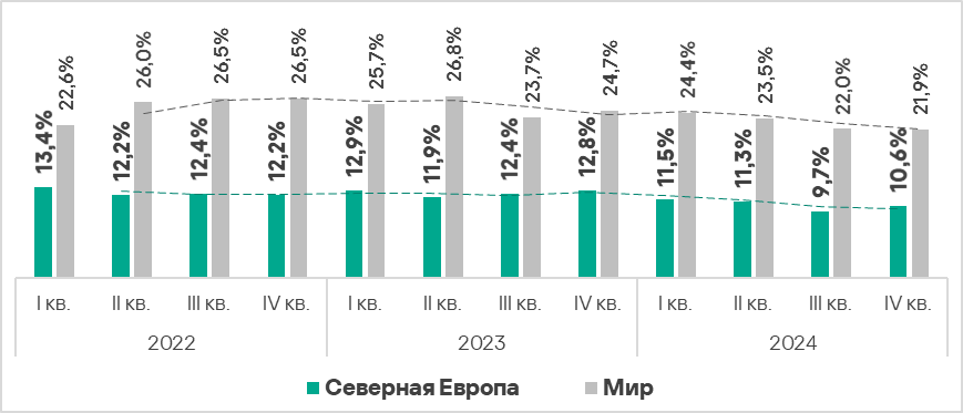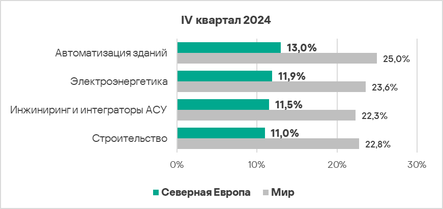 - В четвертом квартале 2024 года доля компьютеров АСУ, на которых были заблокированы вредоносные объекты, в Северной Европе вырос в 1,1 раза. Регион занимает третье место по росту этого показателя в мире.