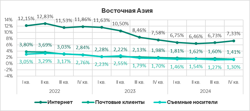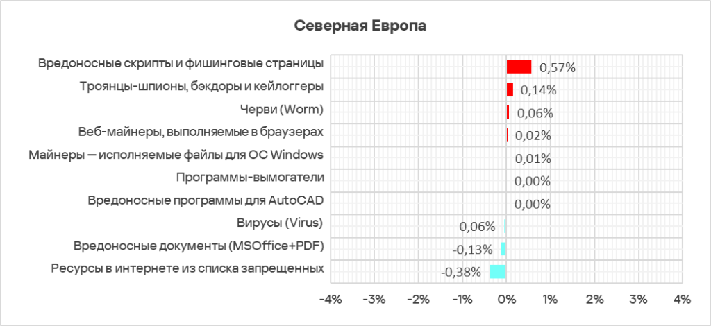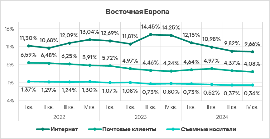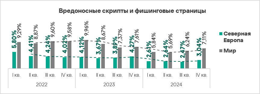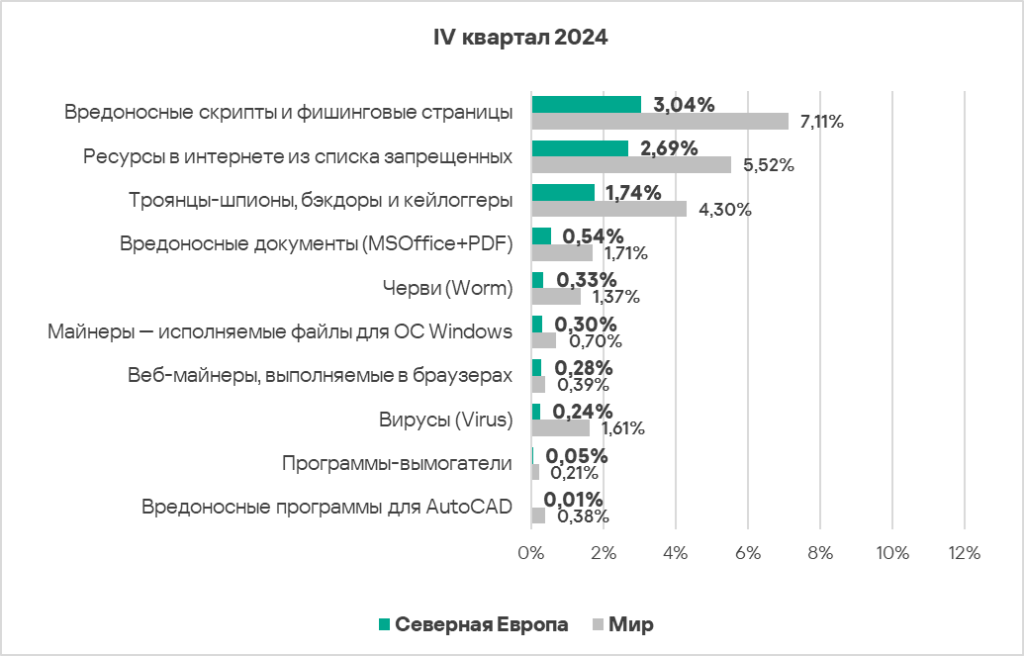 - Тепловая карта иллюстрирует изменения в рейтингах категорий угроз в Северной Европе с начала 2022 года. В четвертом квартале 2024 года вредоносные скрипты и фишинговые страницы вернулись на верхнюю строчку рейтинга.