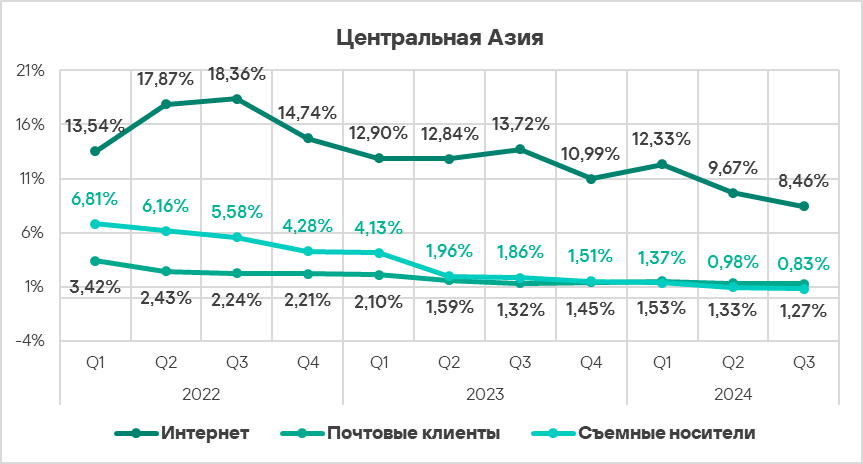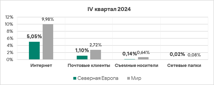 - Уровень угроз из интернета, почтовых клиентов и на сетевых папках снизился.