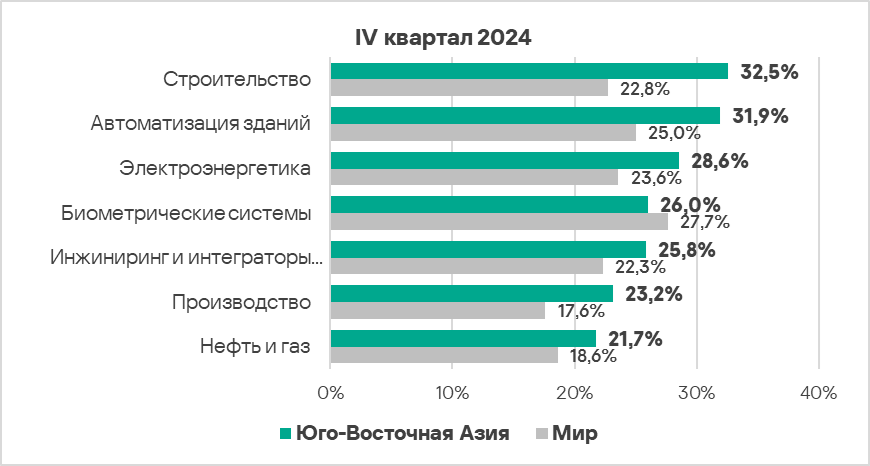 - В четвертом квартале 2024 года доля компьютеров АСУ, на которых были заблокированы вредоносные объекты, выросла во всех рассмотренных отраслях региона. Наибольший прирост за квартал отмечен в следующий отраслях:
