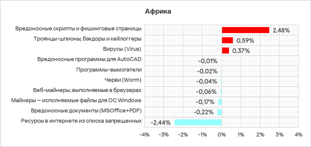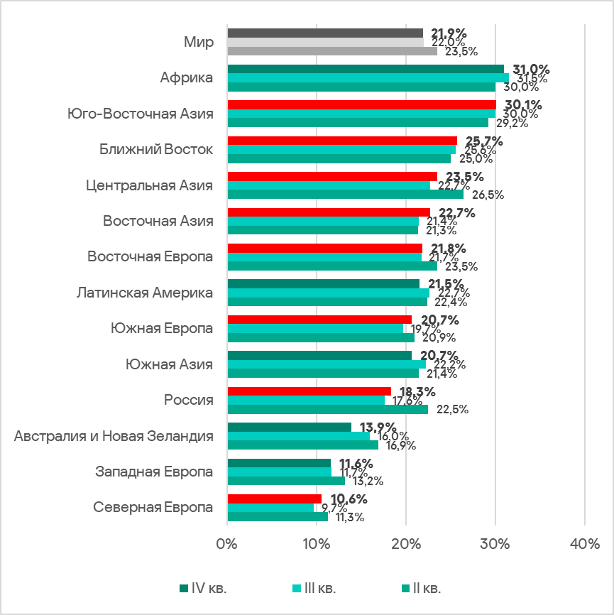 - Африка традиционно занимает первое место в мировом рейтинге по доле компьютеров АСУ, на которых были заблокированы вредоносные объекты. Регион возглавляет многие рейтинги, в некоторых случаях с огромным отрывом.