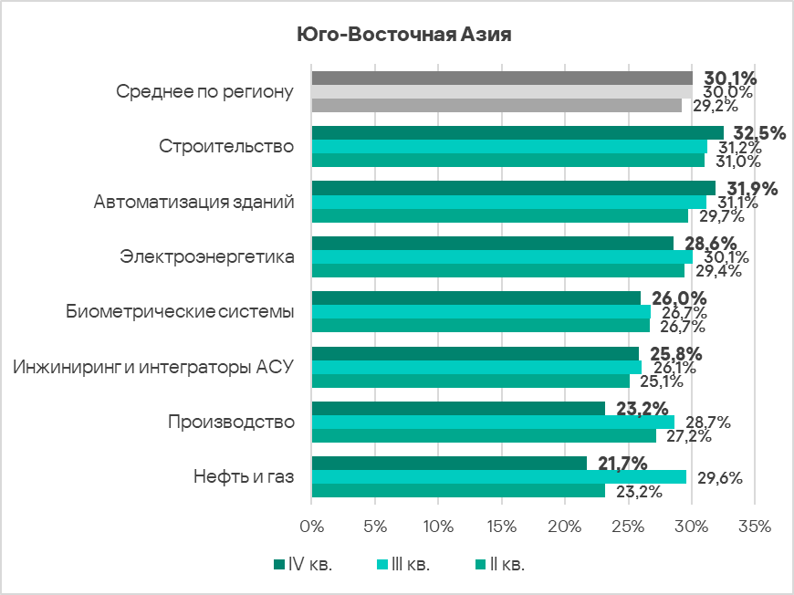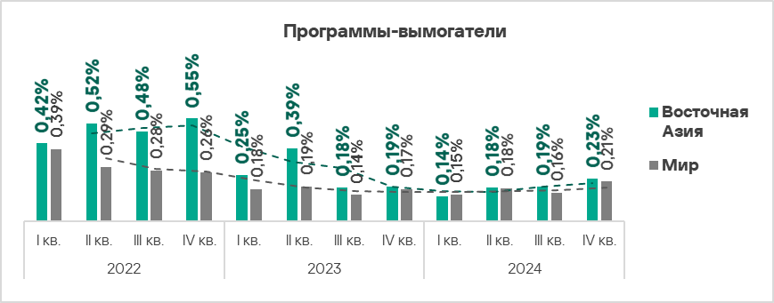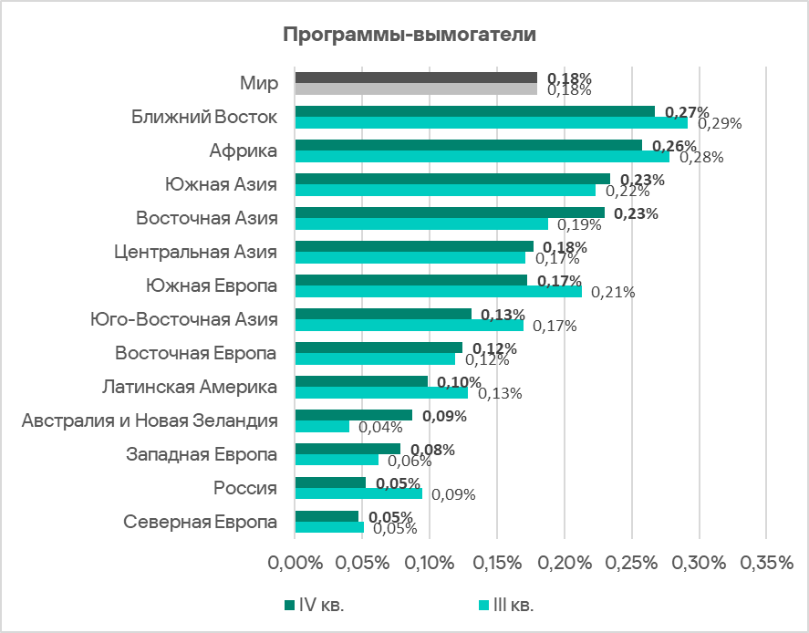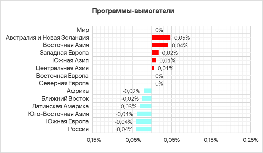 Топ 3 регионов по доле компьютеров АСУ, на которых были заблокированы программы-вымогатели: Ближний Восток, Африка и Южная Азия.