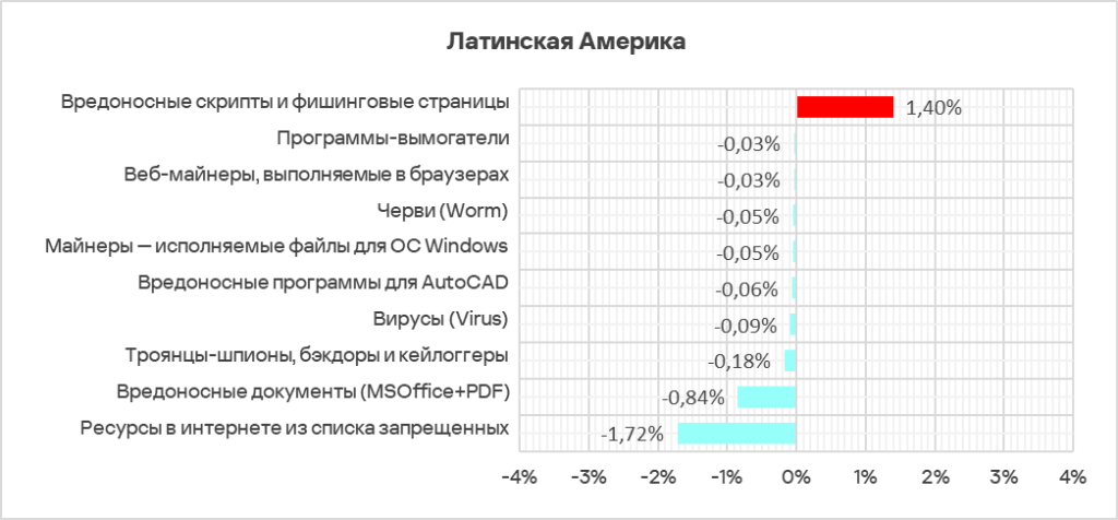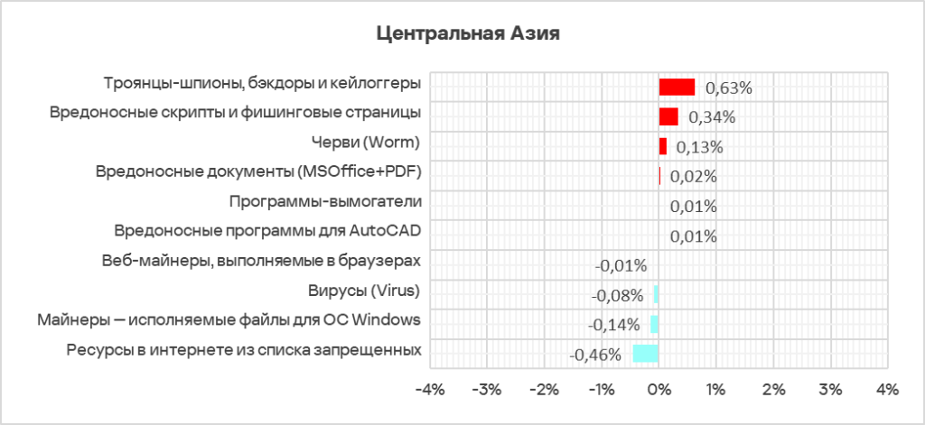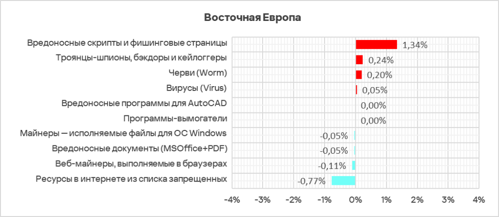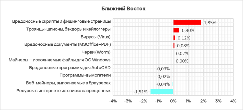 Резкий рост в регионе доли компьютеров АСУ, на которых были заблокированы вредоносные скрипты, вредоносные документы и шпионские программы, отражает масштаб этой волны. - Наибольший прирост в процентах за квартал произошел у доли компьютеров АСУ, на которых были заблокированы следующие категории угроз: