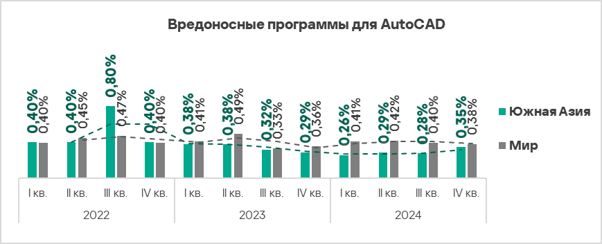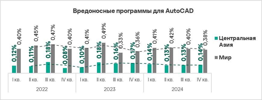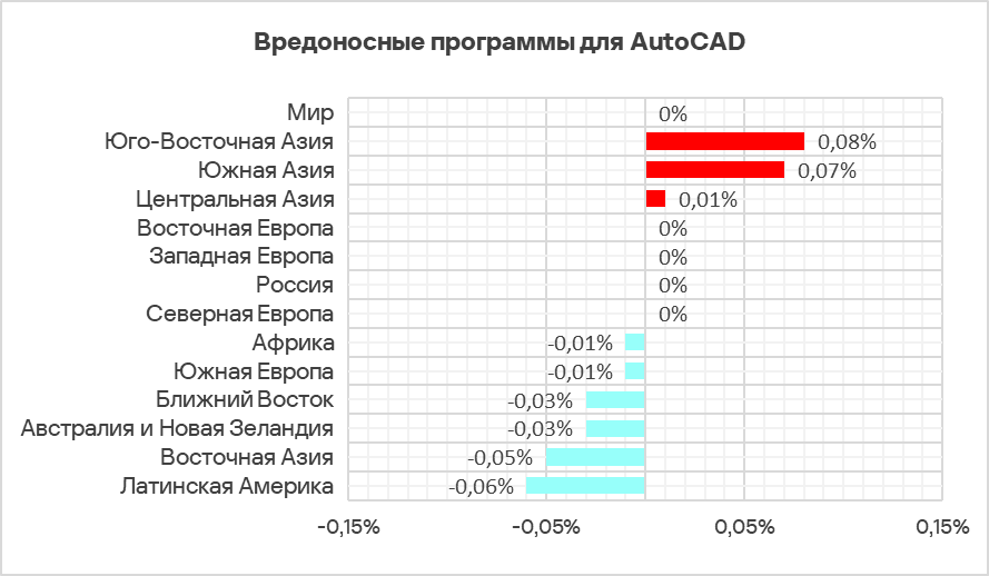 Обычно вредоносное ПО для AutoCAD представляет собой незначительную угрозу и чаще всего занимает последние места в рейтингах категорий вредоносного ПО по доле компьютеров АСУ, на которых оно было заблокировано.