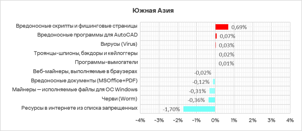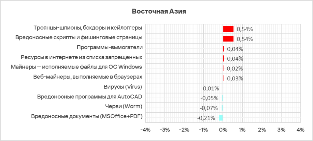- Восточная Азия — здесь программы-шпионы занимают первое место в рейтинге категорий вредоносного ПО по доле компьютеров АСУ, на которых они были заблокированы;