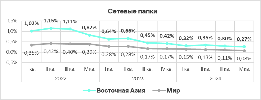 - В четвертом квартале 2024 года доля компьютеров АСУ, на которых были заблокированы угрозы из интернета, выросла и таким образом разошлась с общемировым трендом.