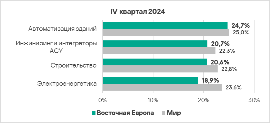 - В четвертом квартале 2024 года во всех рассмотренных отраслях региона, кроме автоматизации зданий, доля компьютеров АСУ, на которых были заблокированы вредоносные объекты, выросла, причем в электроэнергетике — в 1,1 раза.